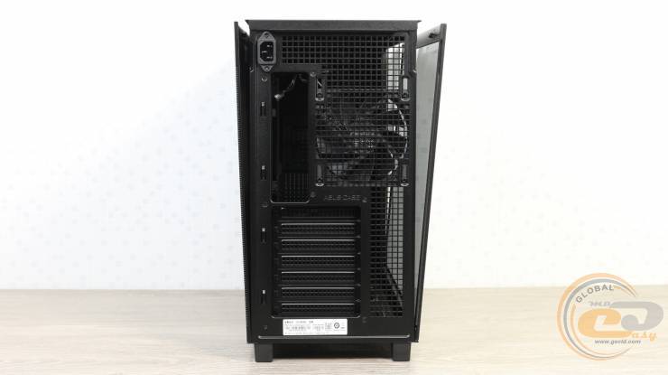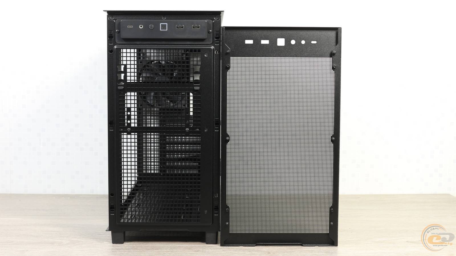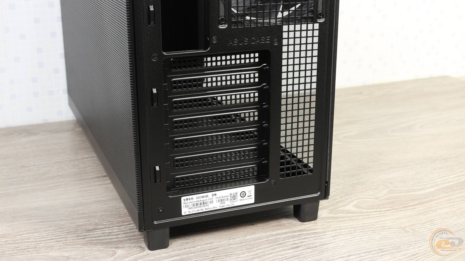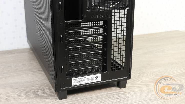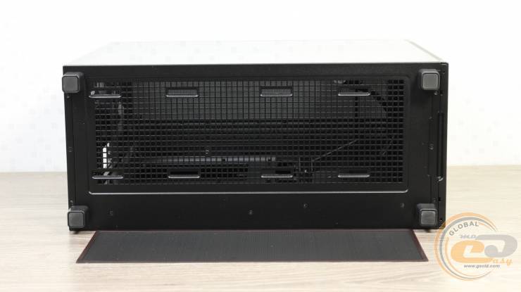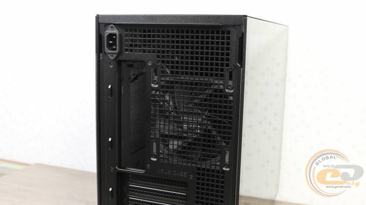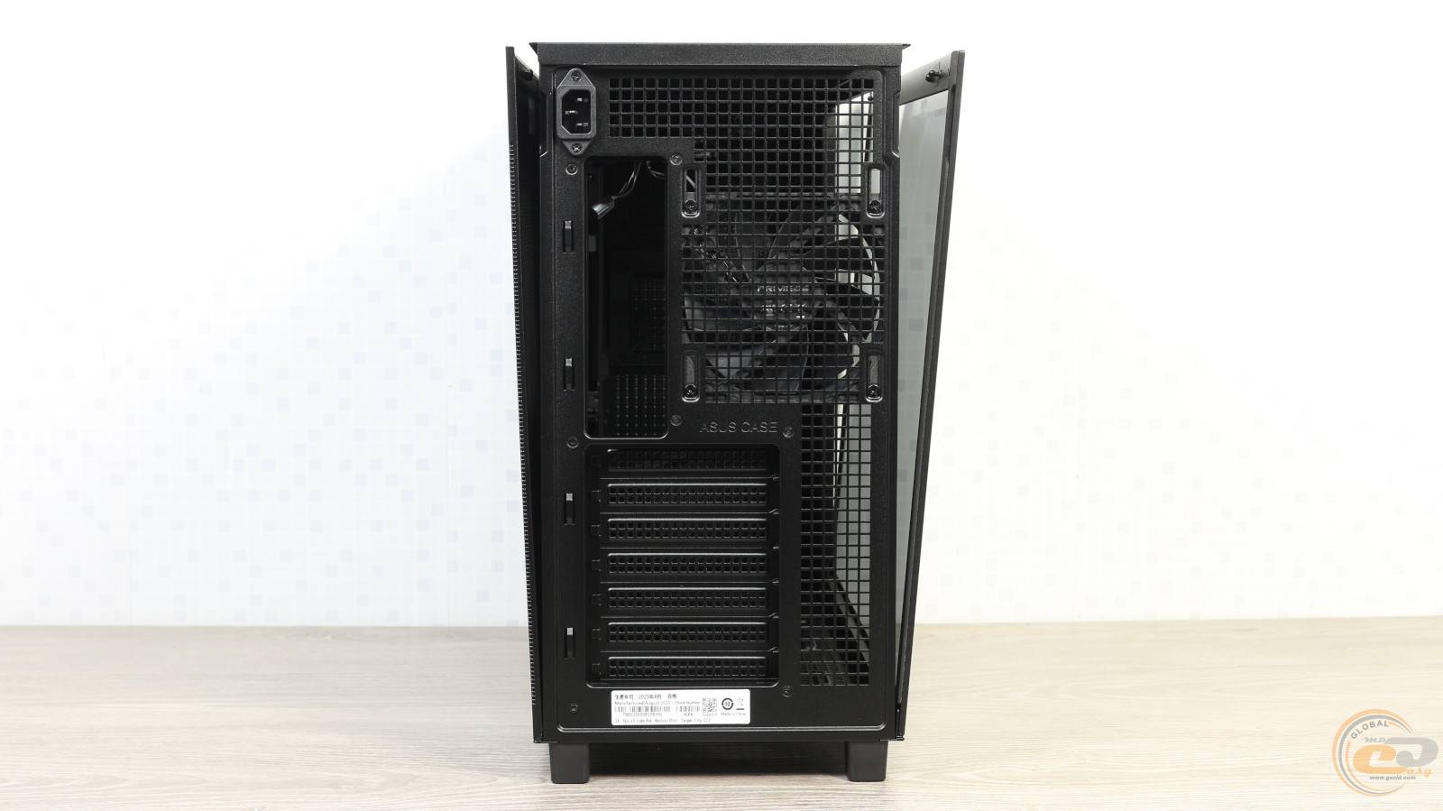 На тыльной стороне корпуса вместо отверстия блока питания есть только разъем для подключения силового кабеля. Сама боковина щедро перфорирована и имеет посадочное место для одного 120-мм вентилятора, где производителем заранее установлена 120-мм девятилопастная вертушка ASUS TC12025MH с поддержкой ШИМ-регулирования скорости вращения до 1500 об/мин. Шум от ее работы на максимуме можно охарактеризовать как средний, но комфортный.