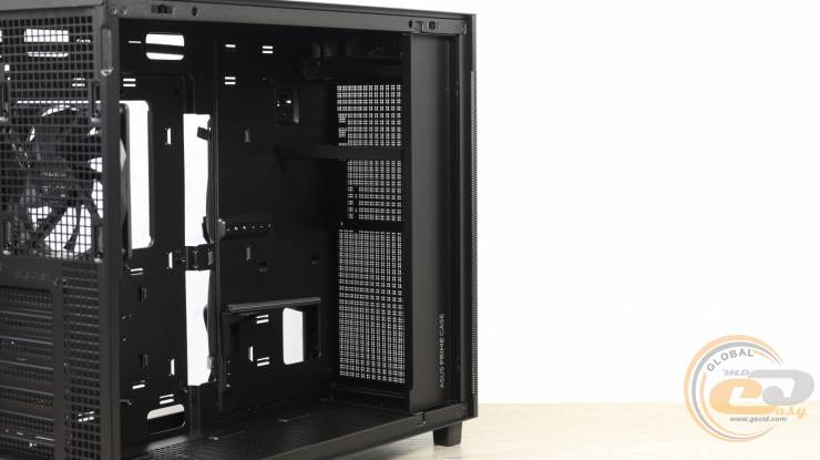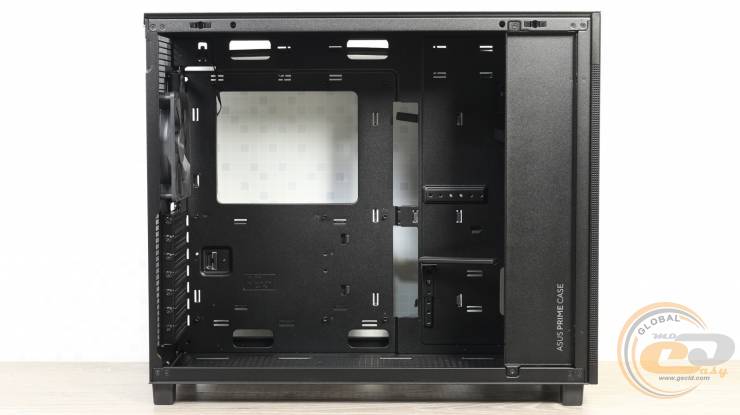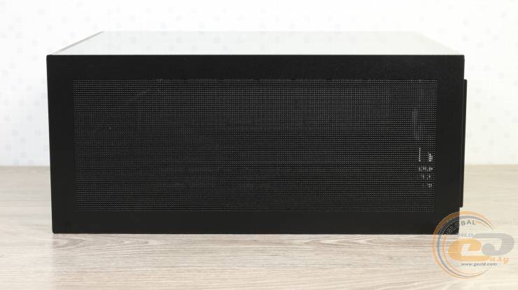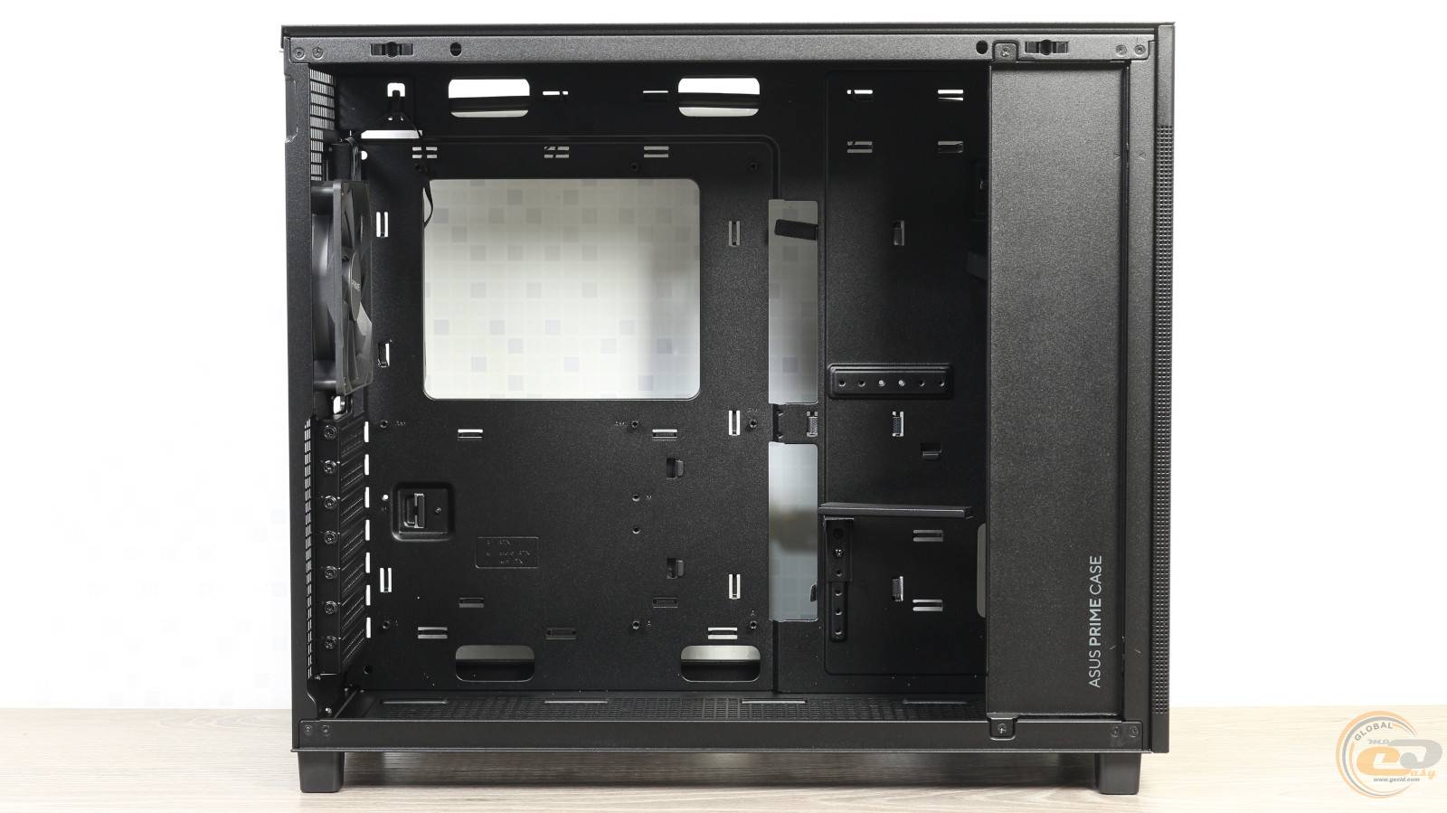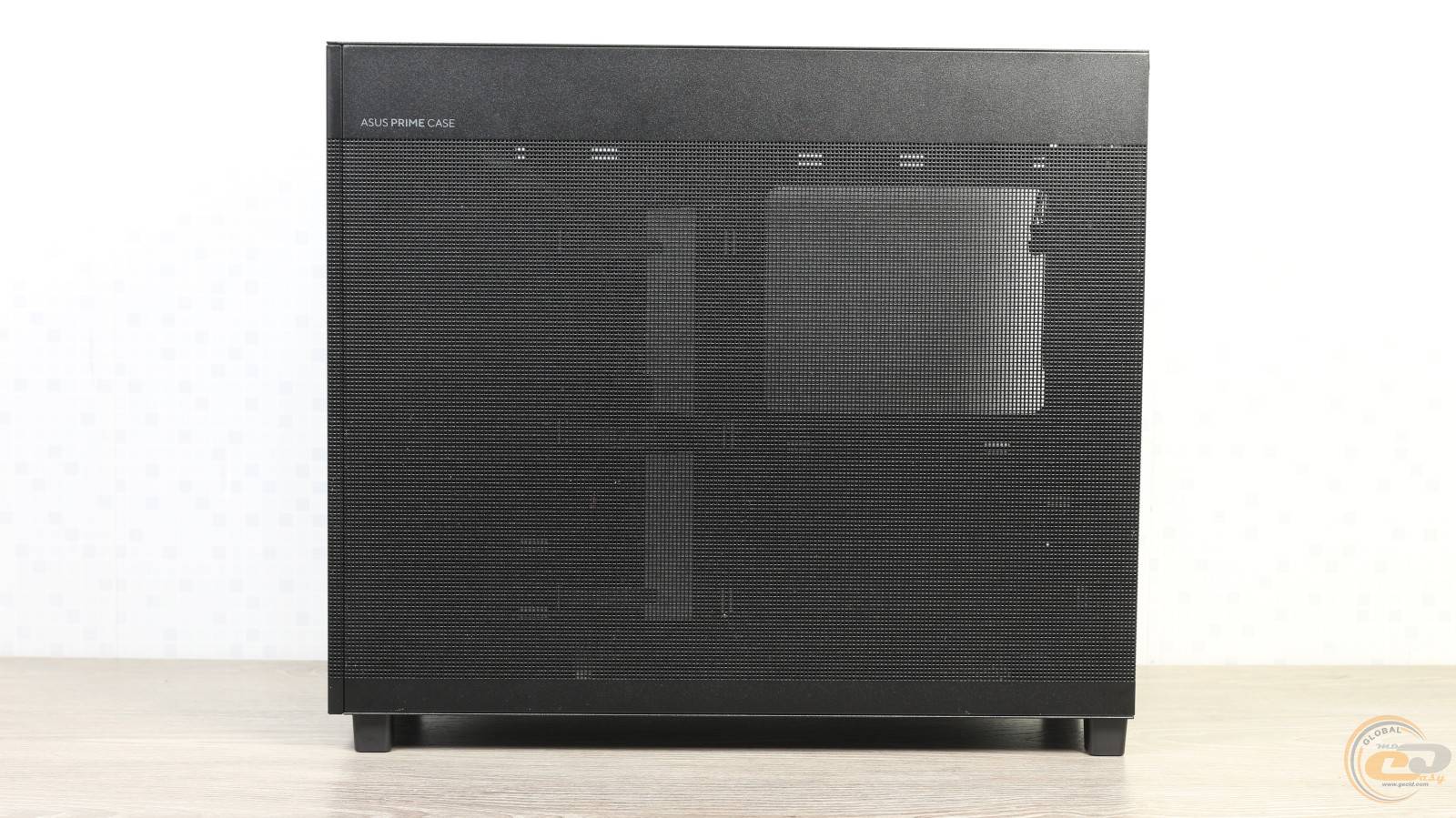 Правая боковая панель выполнена из стали толщиной 0,86 мм и почти полностью перфорирована. На ее внешней стороне ближе к верхнему углу присутствует небольшая надпись "ASUS PRIME CASE". К сожалению, изготовитель и здесь решил обойтись без использования пылевого фильтра.