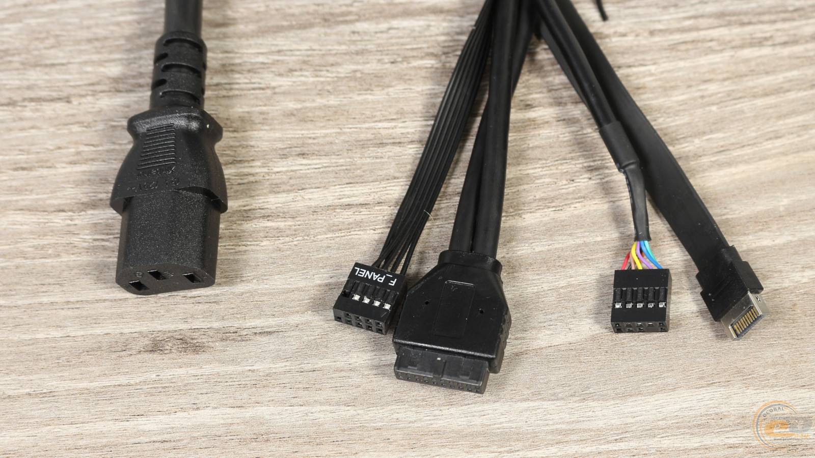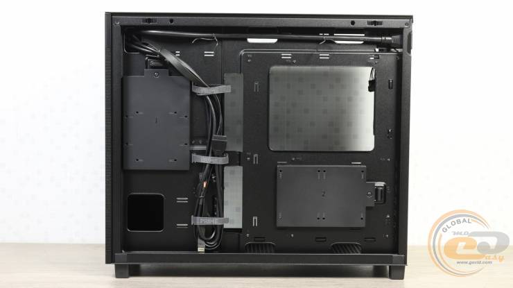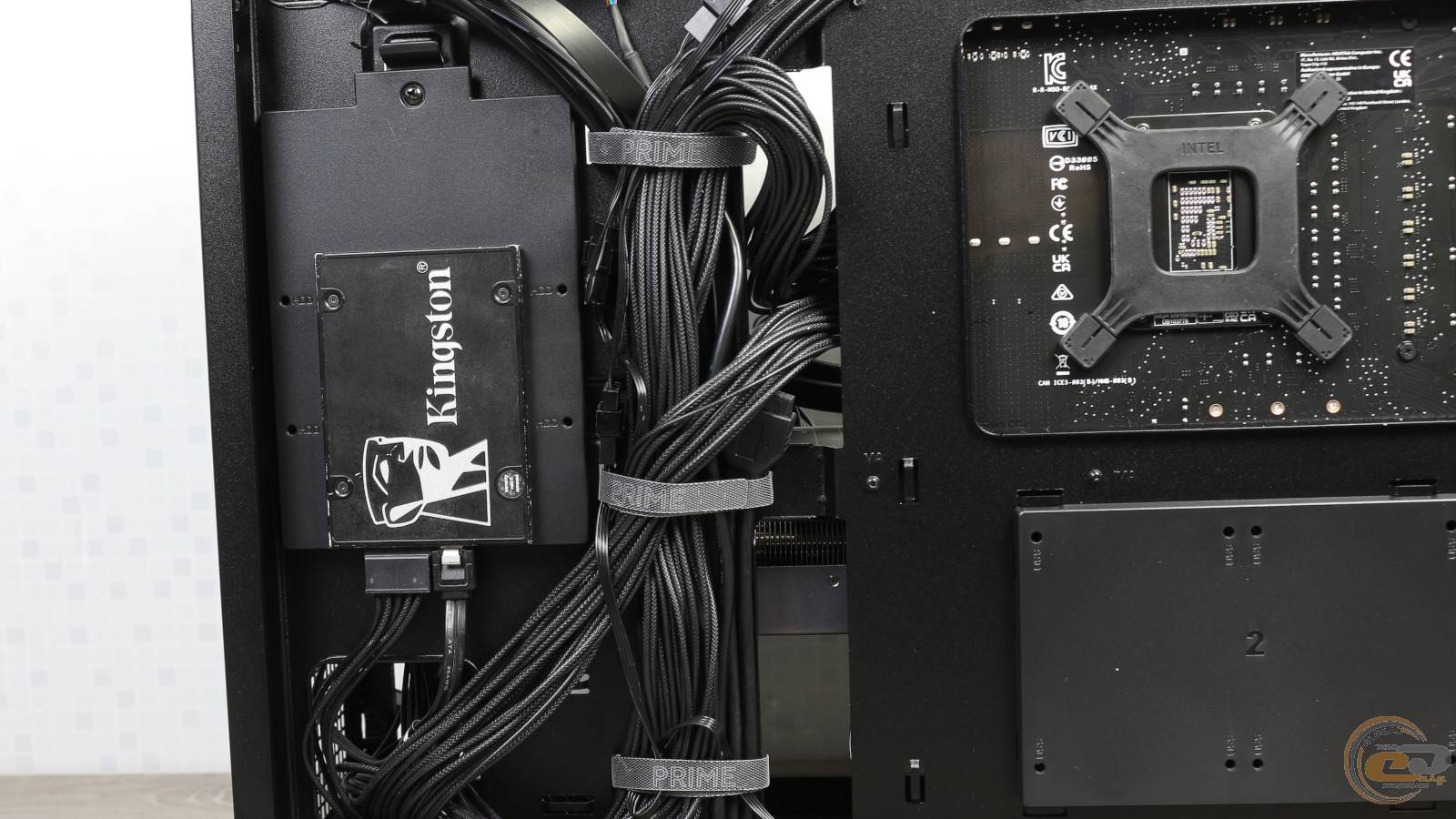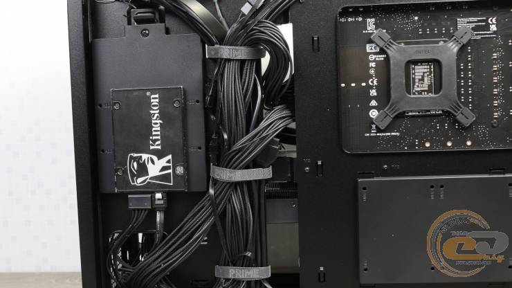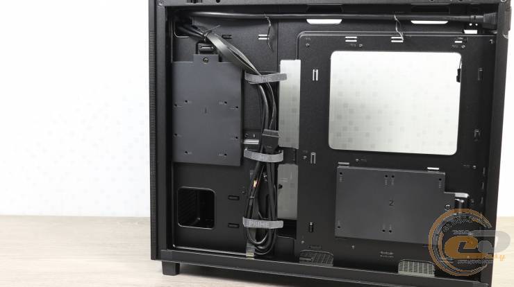 Также за поддоном материнской платы имеется запас пространства для скрытой укладки кабелей, варьирующийся от 10 (ближе к тыльной стенке) до 34 мм (передняя часть корпуса). Хорошо все сгруппировать помогут одноразовые стяжки, входящие в комплект поставки, и три предусмотрительно установленные производителем стяжки-липучки. Единственное, что нужно учитывать — частичную видимость кабелей сквозь сетчатую боковую панель.