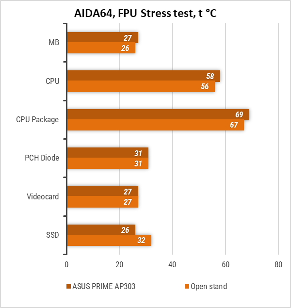 В стресс-тесте AIDA 64 Stress FPU процессор не прогрелся даже до 70°C. Полученная разница между его температурой внутри корпуса и на открытом стенде составила незначительные 2°C. За счет перфорации большей части панелей корпуса все остальные компоненты (за исключением ощутимо остывшего SSD) почти не почувствовали разницы между вышеупомянутыми вариантами.
