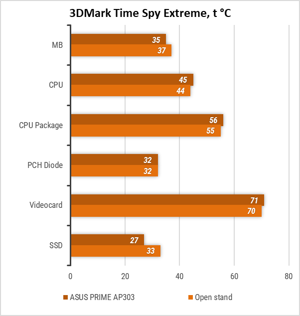 При прохождении бенчмарка 3DMark Time Spy Extreme положение не изменилось, а температуры процессора и видеокарты в корпусе оказались выше всего на 1°C по сравнению с открытым стендом.