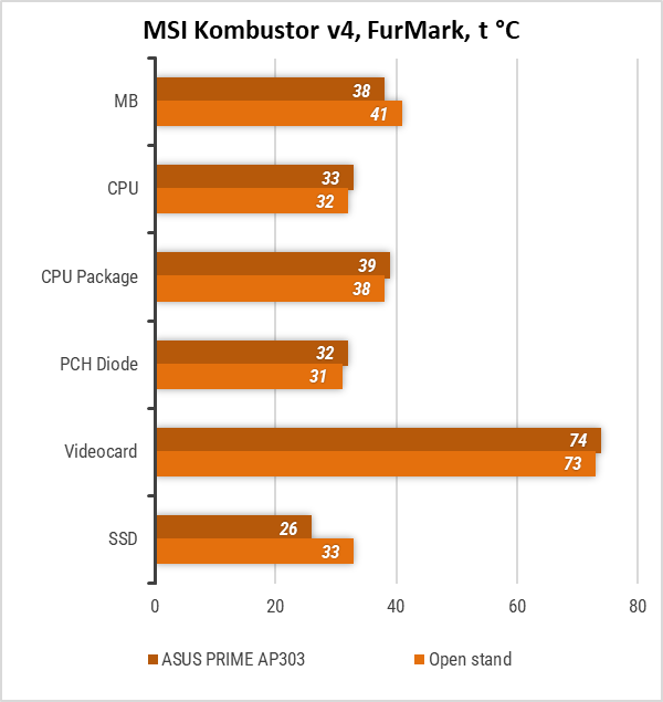 В вопросе показательности результатов оставалась надежда только на тест FurMark в MSI Kombustor v4. Однако он также продублировал ранее зафиксированную разницу в 1°С. То есть температура видеоадаптера на открытом стенде составляла 73°С, а внутри героя нашего обзора – 74°С. Приятно было видеть, что температурные показатели процессора между собой отличались лишь на 1°С.