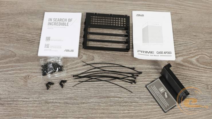 Косметическая металлическая накладка с небольшой надписью серого цвета в передней части корпуса, как и у ASUS Prime AP201, скрывает кабели БП и фиксируется с помощью двух винтов.