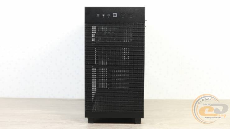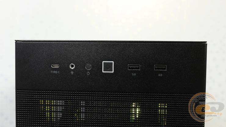 На лицевой стороне корпуса в верхней части можно увидеть один USB 3.2 Gen 2x2 Type-C и два порта USB 3.2 Gen 1 Type-A. Квадратная кнопка запуска ПК оснащена индикатором с приглушенным белым свечением по периметру.