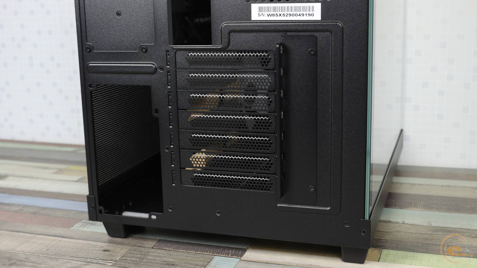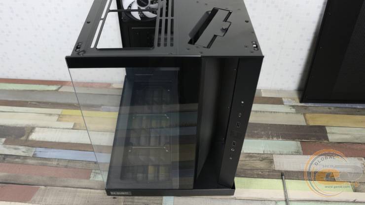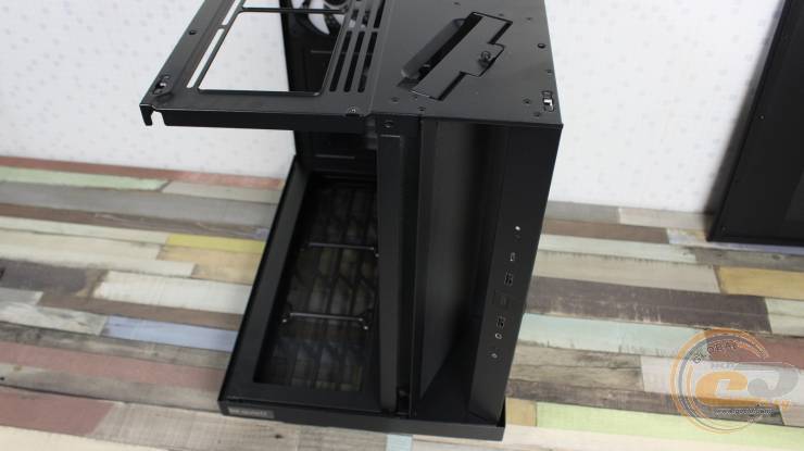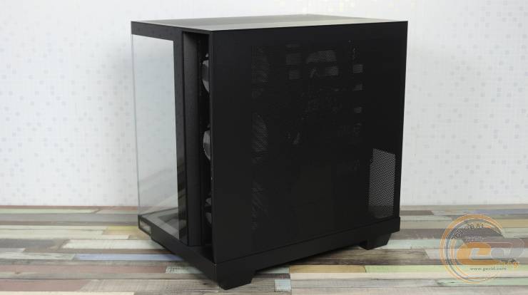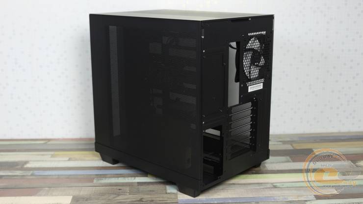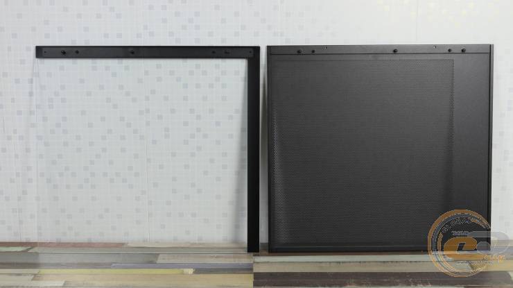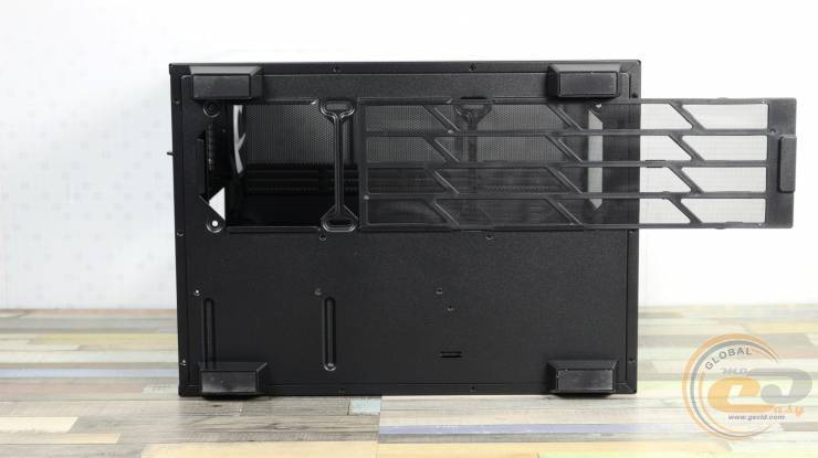 Чтобы снять их, достаточно потянуть на себя и слегка приподнять. Передний и нижний край левой стеклянной панели выполнены полностью прозрачными. Правая стальная крышка, в свою очередь, получила большую перфорированную секцию размером 320×350 мм. Несколько удивляет, что производитель не предусмотрел здесь ни одного пылевого фильтра.