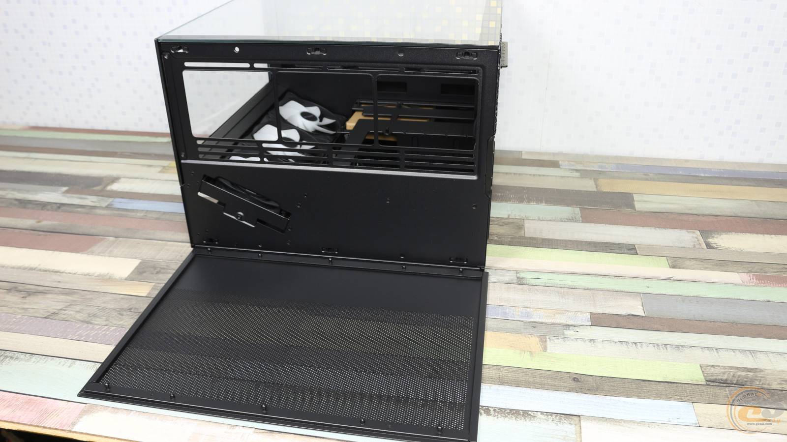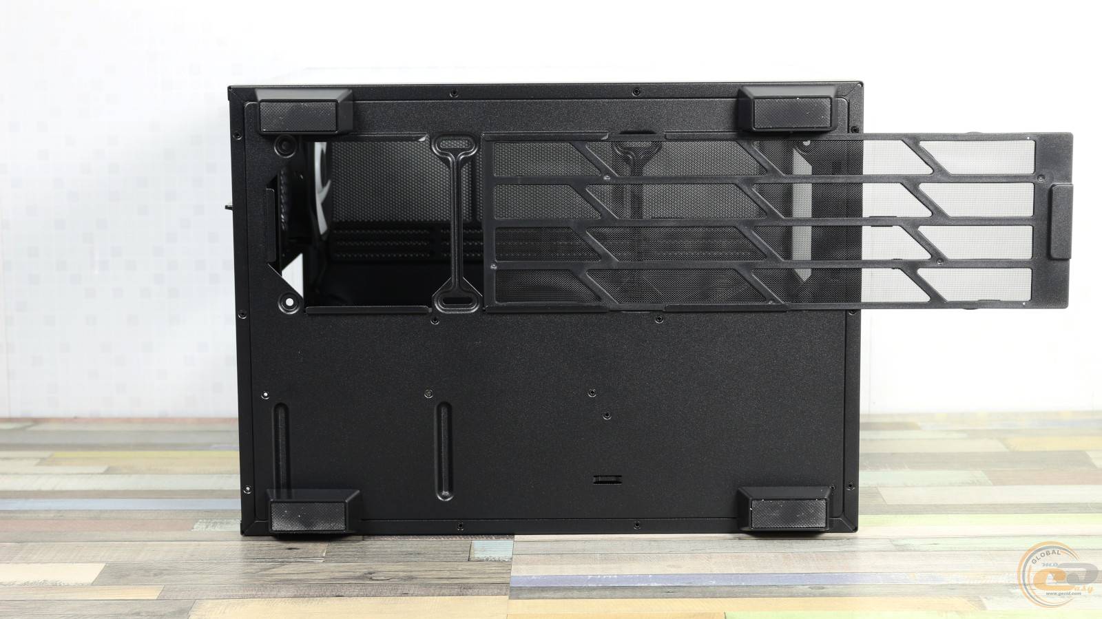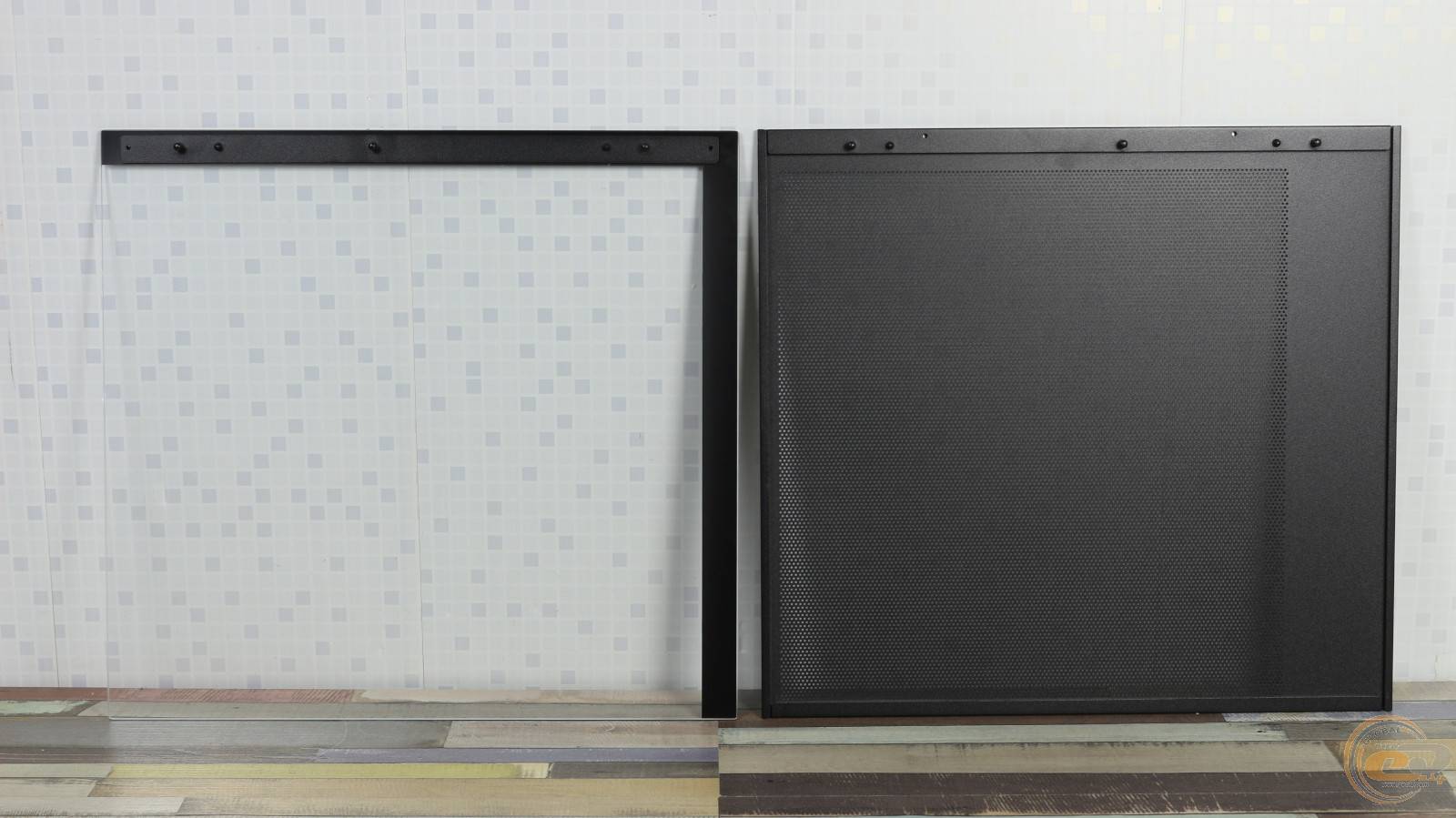 Чтобы снять их, достаточно потянуть на себя и слегка приподнять. Передний и нижний край левой стеклянной панели выполнены полностью прозрачными. Правая стальная крышка, в свою очередь, получила большую перфорированную секцию размером 320×350 мм. Несколько удивляет, что производитель не предусмотрел здесь ни одного пылевого фильтра.