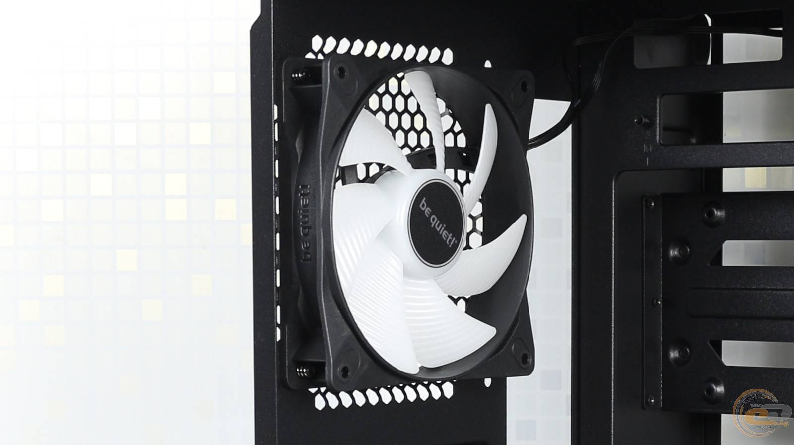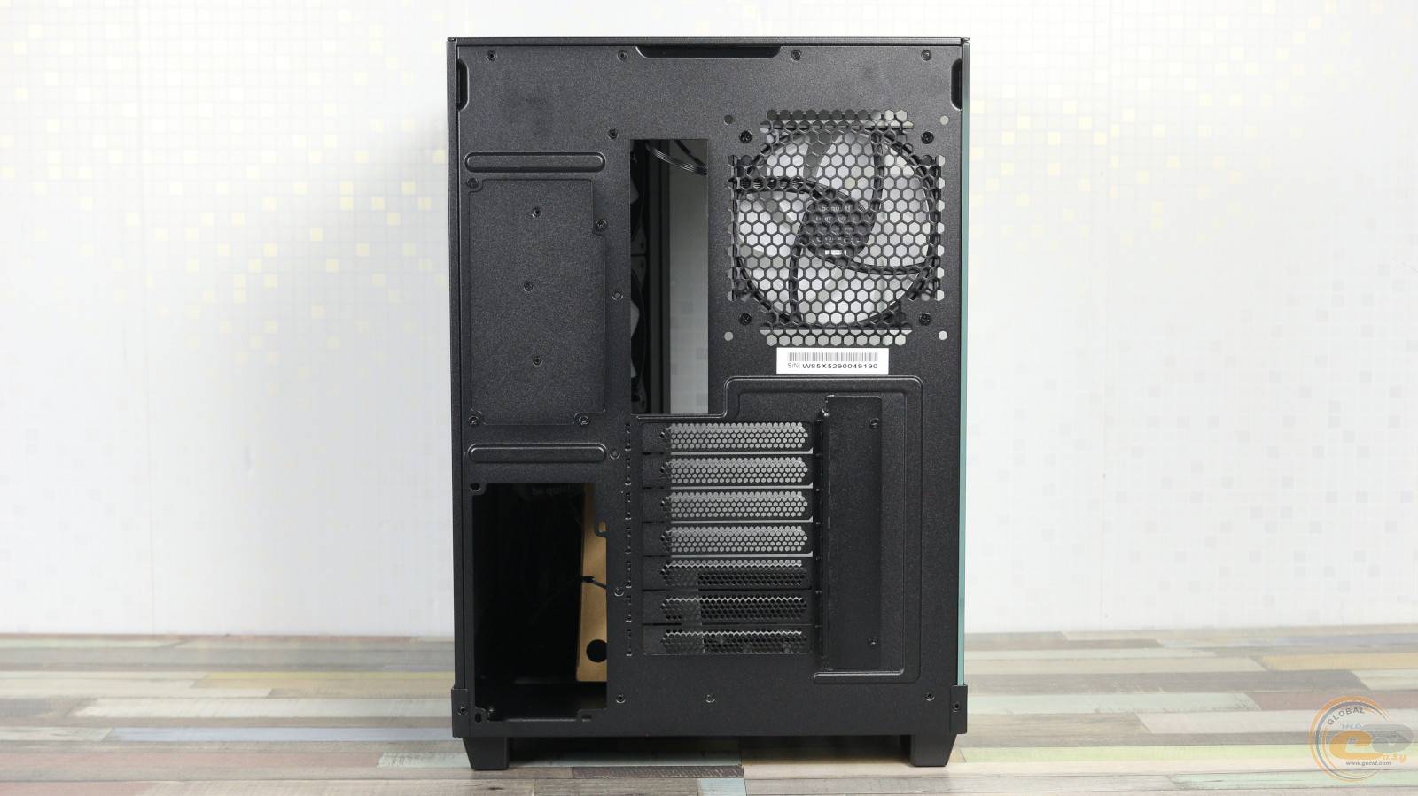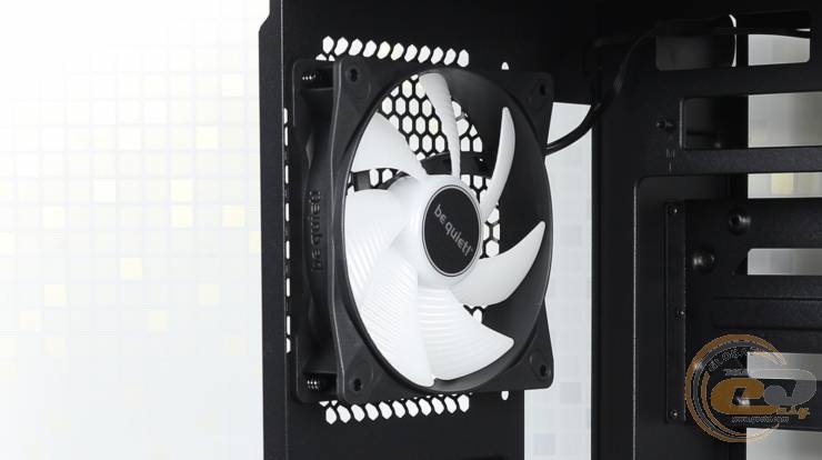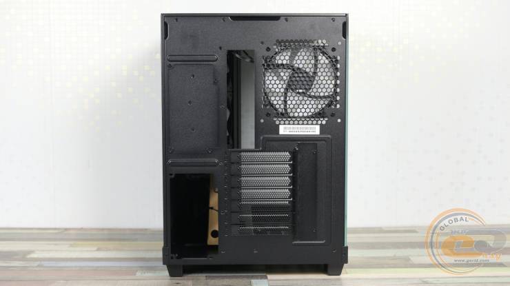 На тыльной стороне корпуса справа можно увидеть посадочное место для одного 120-мм или 140-мм вентилятора, где производителем установлен 120-мм Light Wings LX PWM с поддержкой ШИМ-регулировки скорости вращения до 1600 об/мин с максимальным уровнем шума до 25,5 дБ(А).