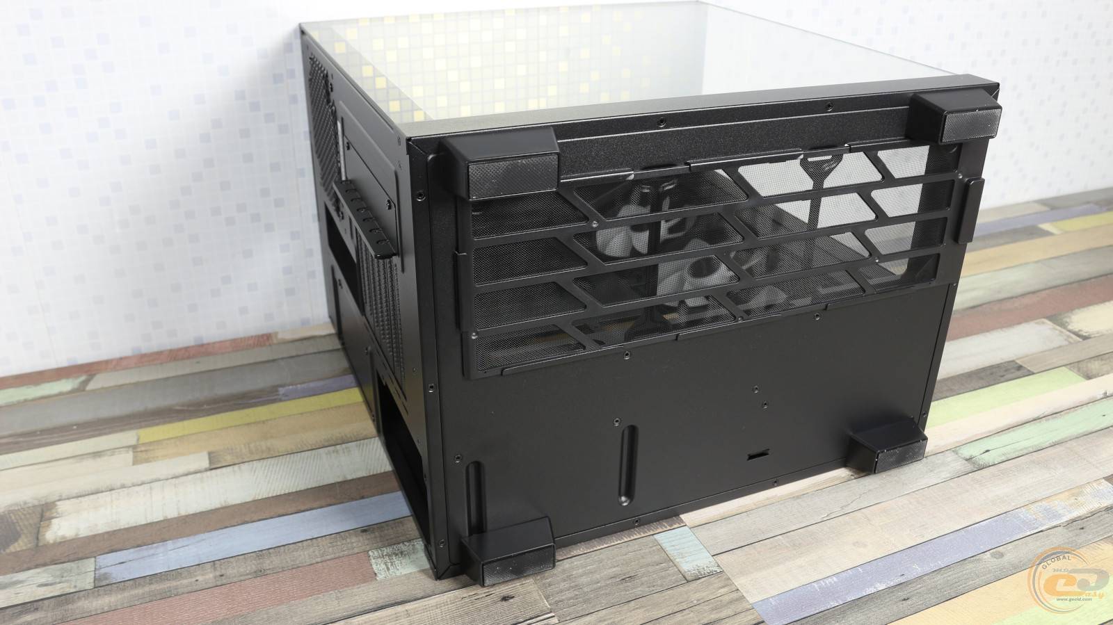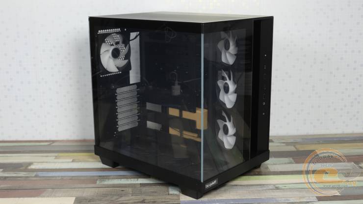 Но от типичных "аквариумов" его отличает наличие на передней стороне большого прямоугольного отверстия, которое служит для забора воздуха установленными под углом вентиляторами.