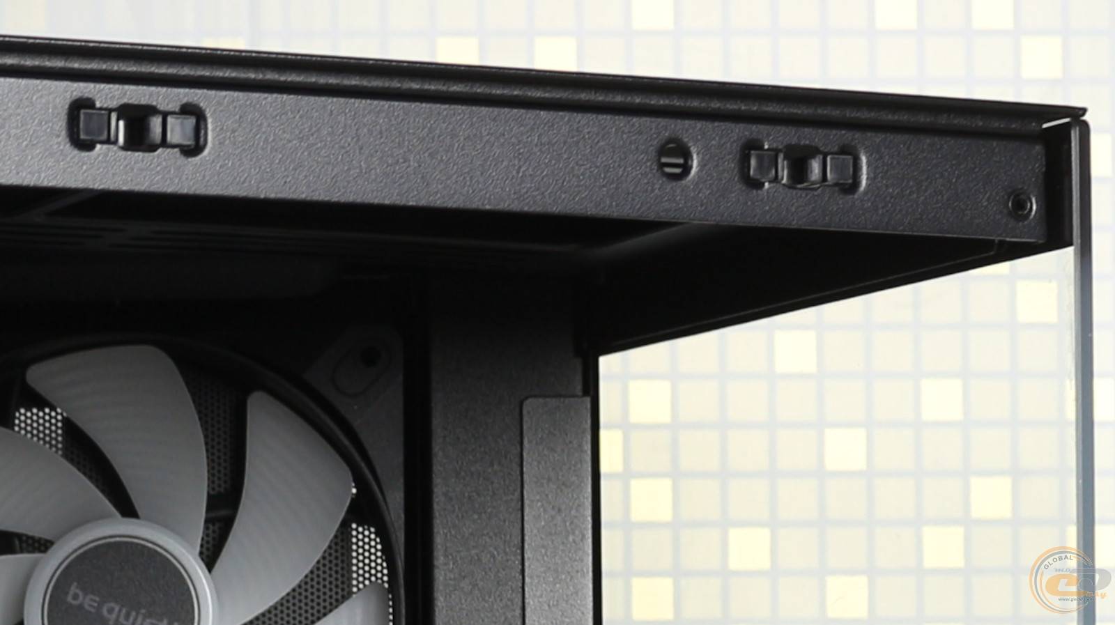 Передняя панель почти полностью выполнена из закаленного стекла толщиной около 3 мм, под которым расположен блестящий логотип be quiet!