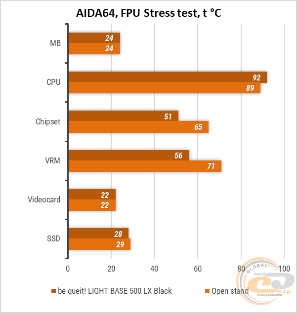 В стресс-тесте AIDA 64 Stress FPU разница между температурой процессора внутри корпуса и на открытом стенде составляла всего 3°C. Ключевые узлы материнской платы, находясь внутри корпуса, напротив, оказались заметно холоднее благодаря дополнительномк охлаждению вентиляторами.