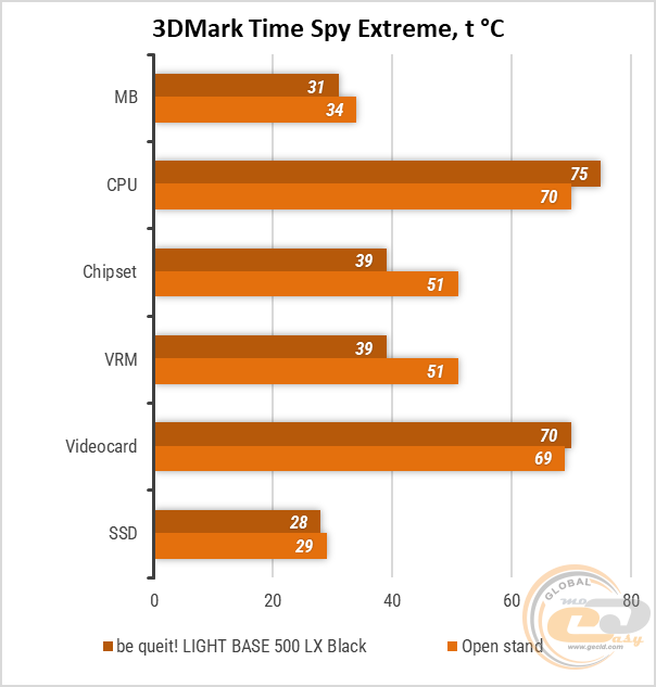В бенчмарке 3DMark Time Spy Extreme ситуация для процессора и видеокарты оказалась схожей. По сравнению с открытым стендом они показали температуры больше на 5°C и 1°C соответственно.