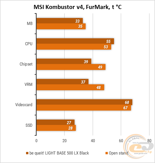 А вот в тесте FurMark в MSI Kombustor v4 хорошо было видно, что видеокарта достаточно эффективно охлаждается в этом корпусе. Разница температур для видеоадаптера между ним и открытым стендом была на уровне погрешности и составила 1°С. Процессор в свою очередь прогрелся до 53°С на открытом стенде и 55°С в корпусе.