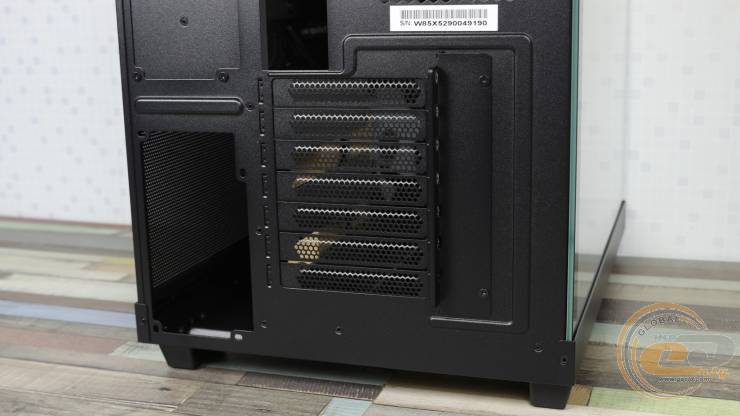 Ниже разместилось семь слотов расширения, закрытых многоразовыми перфорированными заглушками. Если необходимо установить видеокарту вертикально, эту панель можно заменить на комплектную. Но райзер-кабель для подключения видеоадаптера придется приобрести отдельно.