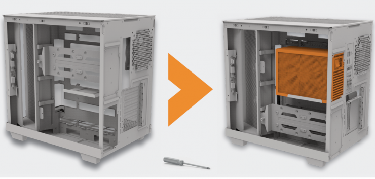 Один 3,5″ жесткий диск и два SSD крепятся винтами с обеих сторон съемной панели, находящейся выше стандартного места для монтажа блока питания.