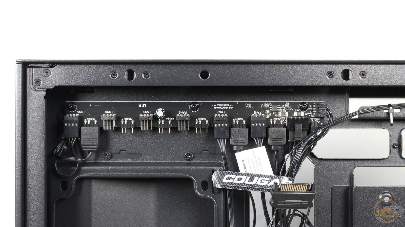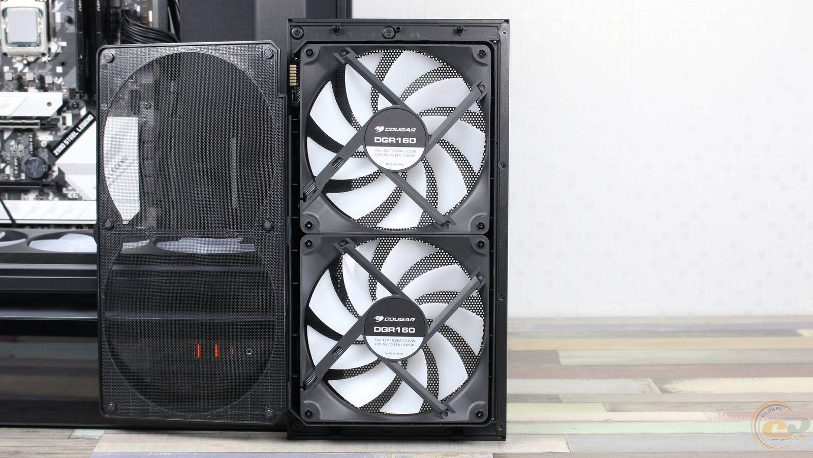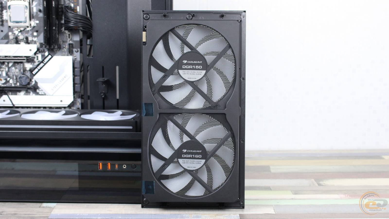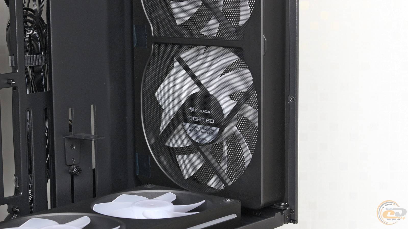 Последний держится на шести магнитах и дополнительно зафиксирован клеящимися лентами. Под ним можно рассмотреть вертушки Cougar DGR160, получившие светлые лопасти, ARGB-подсветку и ШИМ-регулировку скорости вращения в пределах от 500 до 1200 об/мин. Что касается энергопотребления, то электродвигатель нуждается в 3,12 Вт (0,26 А при 12 В), тогда как светодиоды — до 1,65 Вт (0,33 А при 5 В).