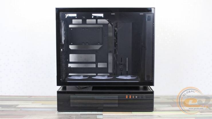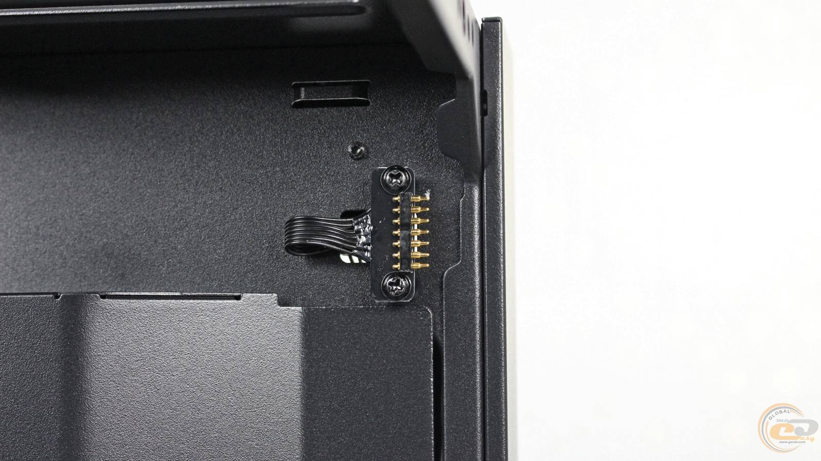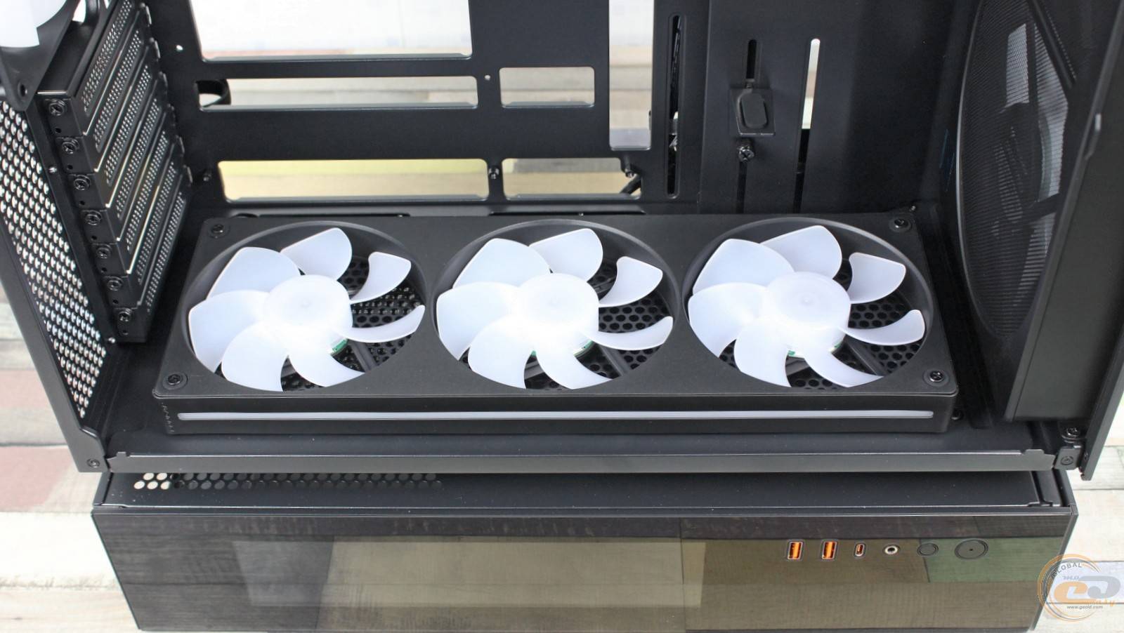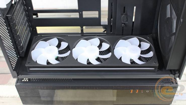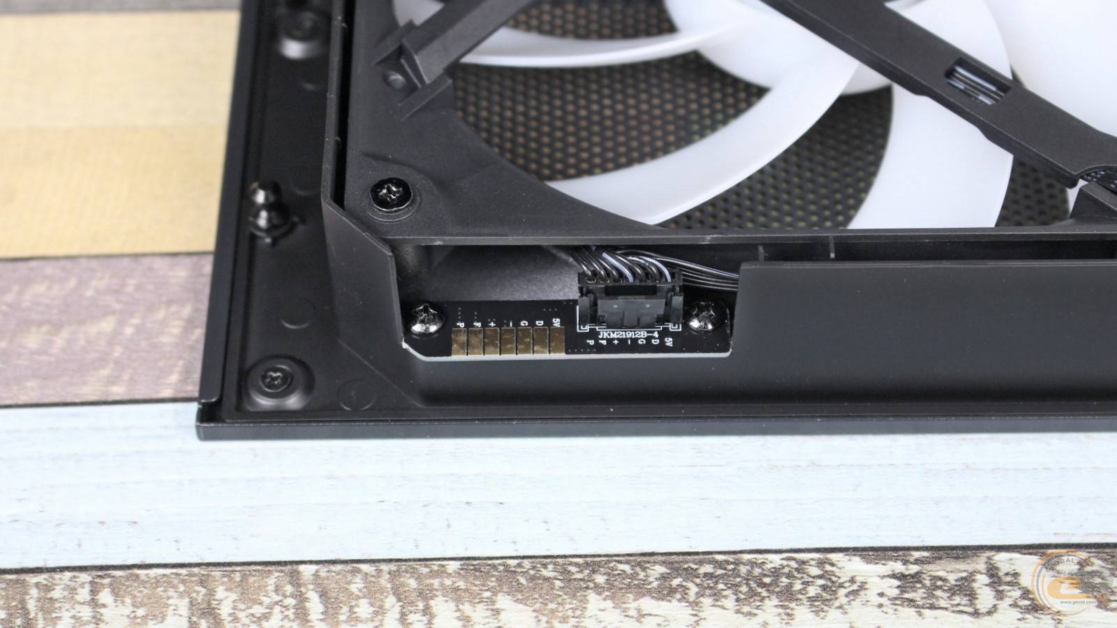 На дне виден набор из трех 120-мм пропеллеров в общей рамке – Unity 360 ARGB PWM. Их наличие здесь должно обеспечить хороший приток воздуха снизу, чего не хватает корпусам с привычной компоновкой. Скорость вращения этой троицы изменяется ШИМ-методом в пределах от 700 до 1600 об/мин. Фиксируется такая конструкция всего четырьмя винтами, а для подачи питания и подсветки имеется по одному коннектору. Впрочем, такой подход имеет свои минусы — при выходе из строя одного из вентиляторов заменять придется весь блок.