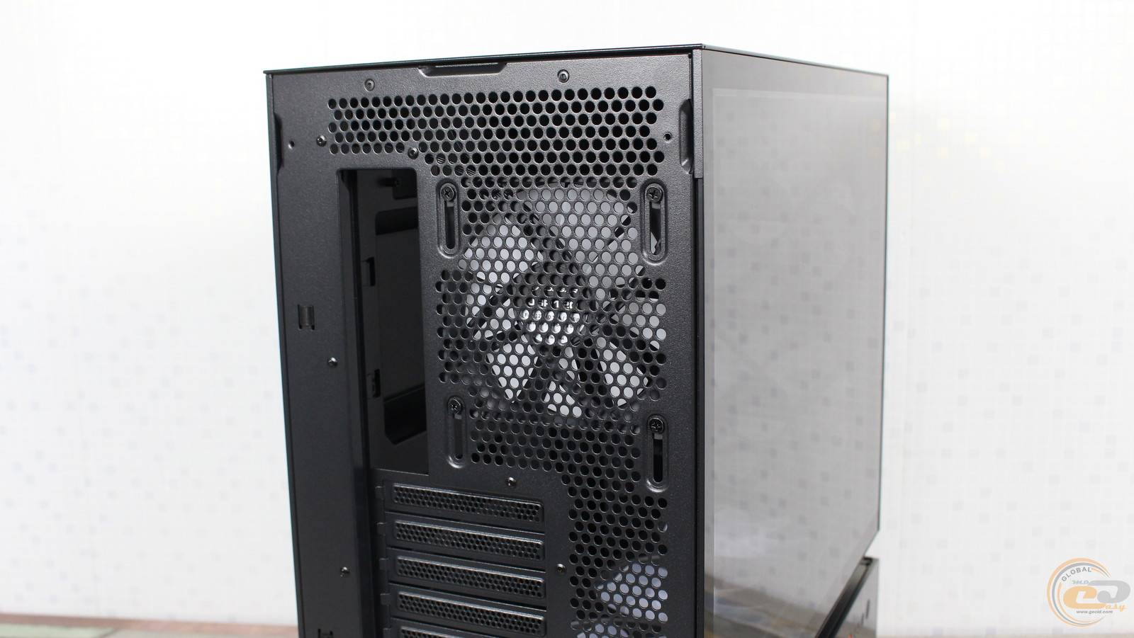 Что касается тыла COUGAR CFV235 Mesh Vision Black, то его компоновка довольно привычная. Справа сверху расположен 120-мм вентилятор с возможностью регулировки положения по высоте. Его светлые лопасти намекают на наличие LED-подсветки, а скорость регулируется в пределах от 500 до 1400 об/мин.