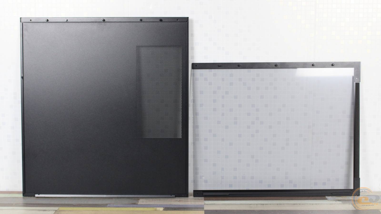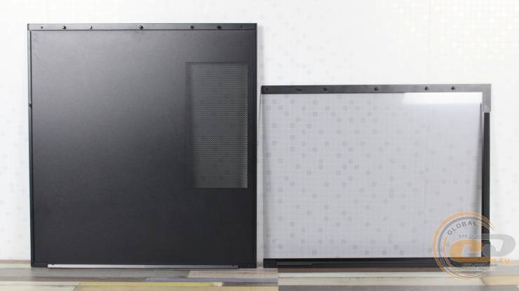 Фиксация панели осуществляется безвинтовым способом с помощью штырей в верхней части и направляющей внизу. Аналогичным образом реализовано и крепление 3-мм стеклянной боковины.