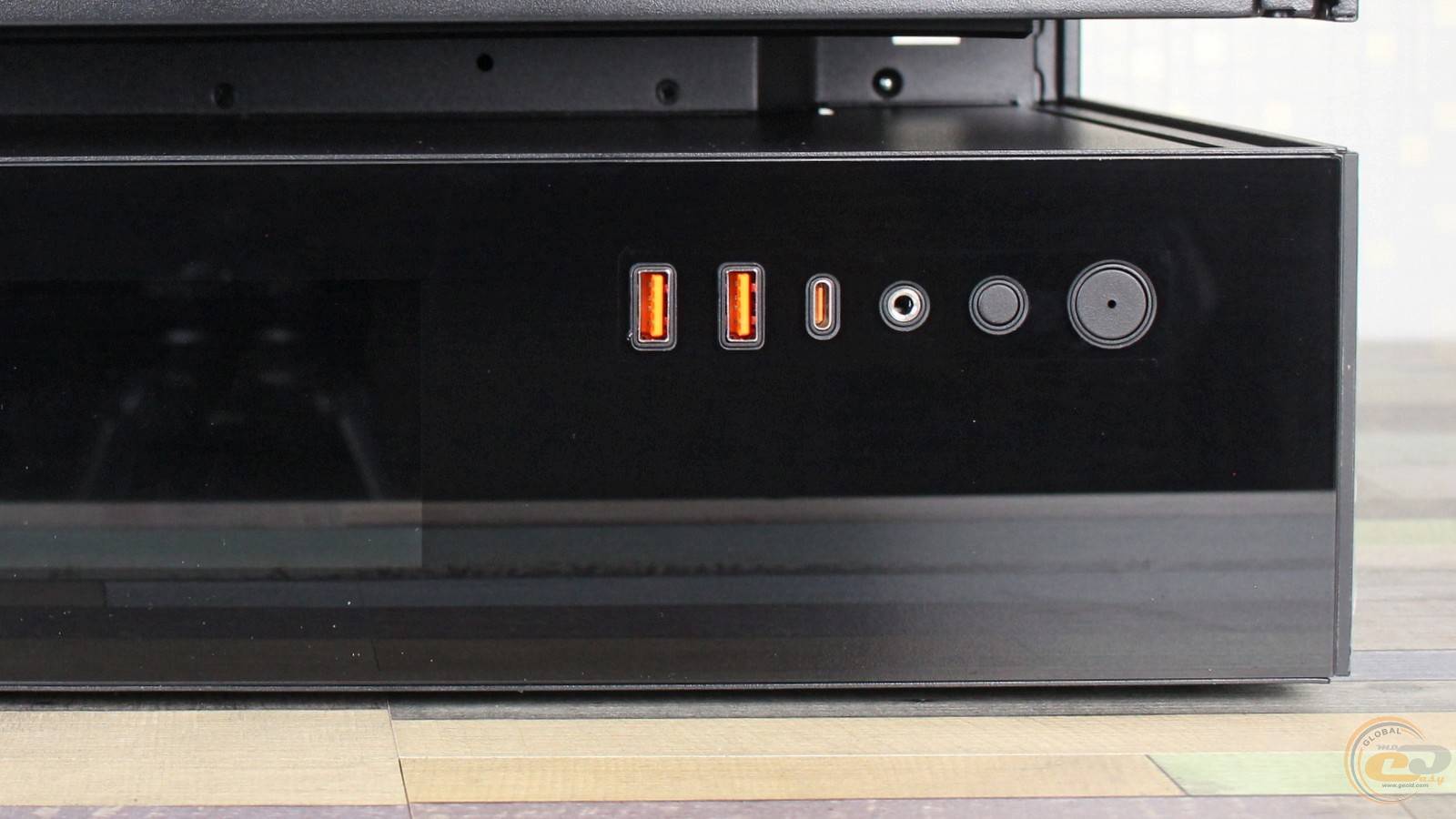 Оранжевые подкладки USB-портов привлекательно смотрятся на черном фоне. Таким образом обозначены 20-гигабитный USB 3.2 Gen 2x2 Type-C и пара 5-гигабитных USB 3.0 – отличный набор для подключения разнообразных девайсов. Рядом есть комбинированный 3,5-мм аудиопорт, а также кнопки управления LED-подсветкой и включение со встроенным индикатором питания – обе имеют короткий и четкий ход.