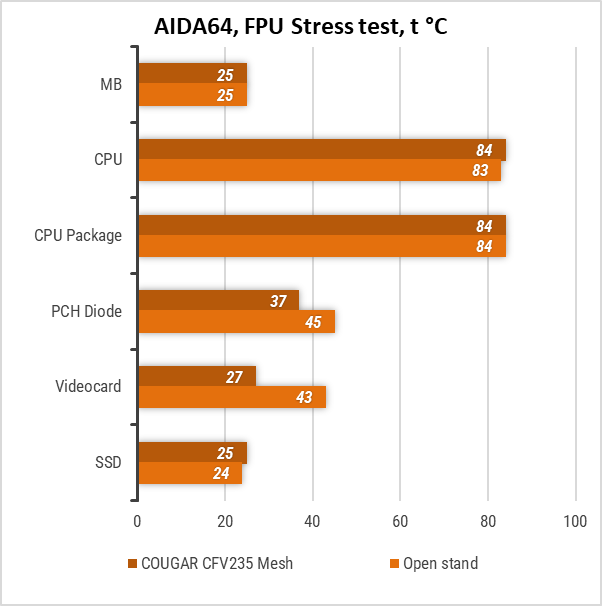 В FPU Stress Test AIDA64 разницы в нагревании процессора в корпусе и на открытом стенде практически не было. То же самое касается и температуры материнской платы. Зато чипсет и видеокарта оказались на существенные 8-16°C более холодными как раз внутри корпуса — активное охлаждение сказывается.