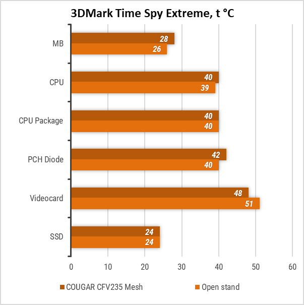 В бенчмарке 3DMark Time Spy результаты очень похожие – разница достигает не более 3°C в пользу то одного, то другого сценария использования.