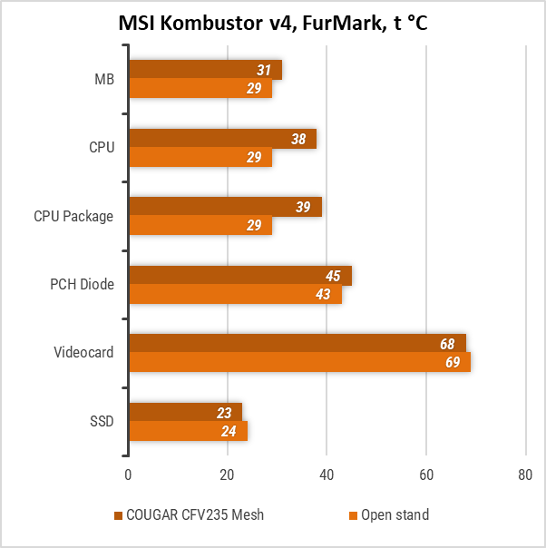 И наконец в FurMark нагрев видеокарты в корпусе был на 1°C ниже, чем на открытом стенде. А вот единственный элемент, температура которого действительно существенно отличалась, – это процессор. Впрочем, речь идет о значениях при минимальной нагрузке, тогда как показатели при более значительной мы уже видели в тесте AIDA64.