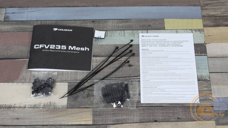 Коробка из простого картона оборудована парой вырезов и содержит спецификацию и общее изображение корпуса COUGAR CFV235. Конкретную модель, которая находится внутри, можно определить только по дополнительным наклейкам, где указан цвет устройства и перечислены предварительно установленные вентиляторы и другие дополнительные элементы.