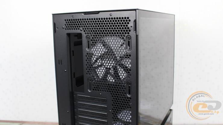 Верхняя панель фиксируется девятью штифтами, поэтому ее очень легко снять. Большая площадь перфорации позволяет установить здесь пару 140-мм или три 120-мм пропеллера. Если же в планах будет установка СЖО, то это единственная подходящая для этого зона. Причем сюда поместятся как топовые 360 мм и 280 мм, так и более компактные модели.