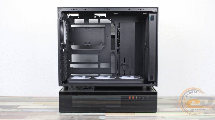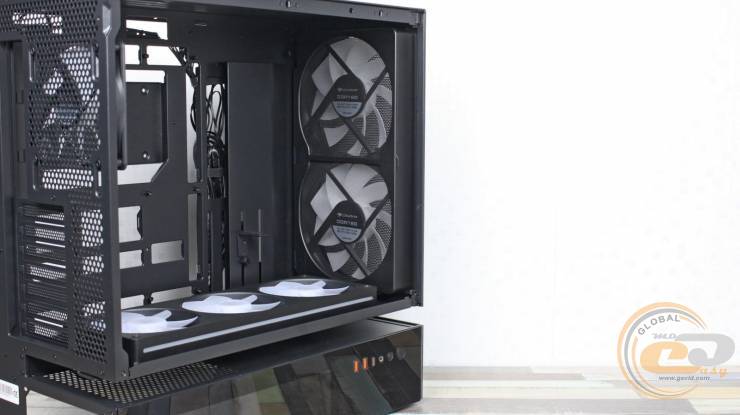 А теперь заглянем за металлическую боковину. Слева видны два посадочных места для 120-мм вентиляторов – они здесь устанавливаются в более доступных версиях корпуса без фронтальных пропеллеров. В данном же случае производитель в спецификации даже не упоминает о такой возможности, ведь изнутри отверстия перекрываются сплошной пластиной.