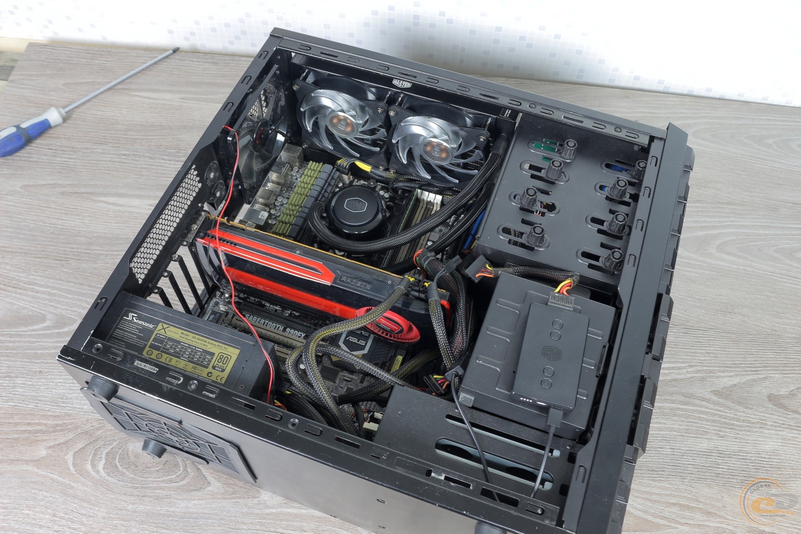 Остается только нанести термоинтерфейс, опустить водоблок на шпильки и последовательно (по диагонали) затянуть крепежные гайки с насечкой. Для этого можно воспользоваться отверткой с плоским жалом. В конце подключаем пропеллеры и помпу к контроллеру, а его − к материнской плате через USB-колодку.