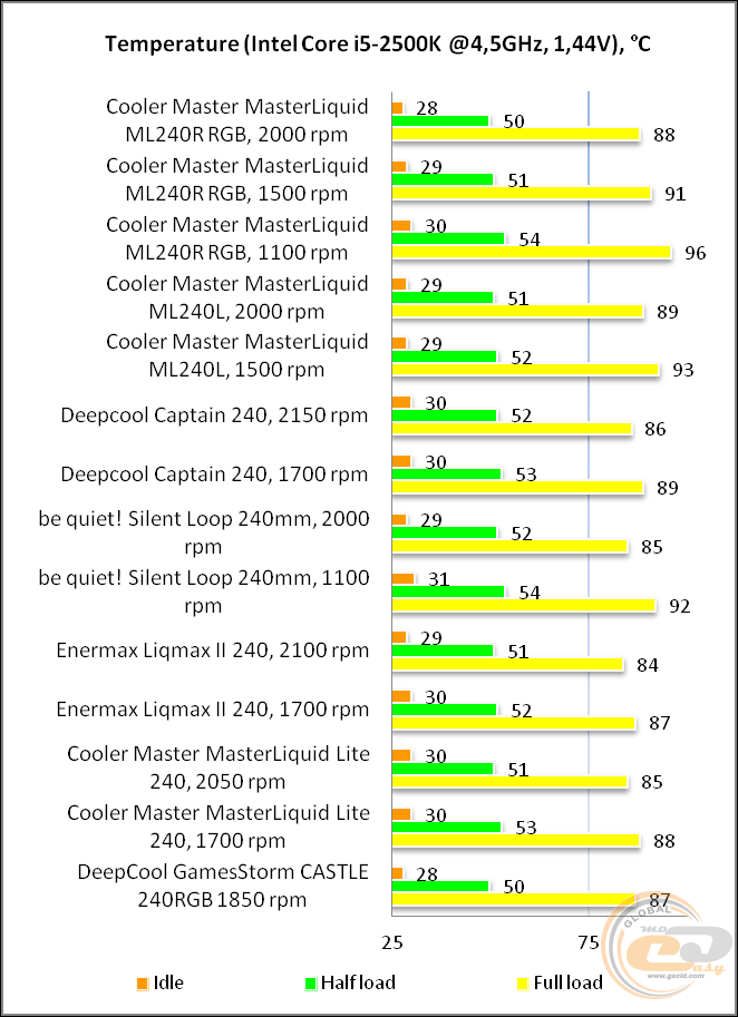 Cooler Master MASTERLIQUID ML240R RGB − очень достойная двухсекционная водянка. Да, она не ставит рекордов, но на максимальных скоростях смотрится не хуже основных конкурентов. На средних и низких частотах она уже проигрывает им несколько градусов. Сказывается ее плотный радиатор. Но в любом случае она справляется с охлаждением разогнанных до 4 − 4,5 ГГц многоядерных стендовых процессоров.