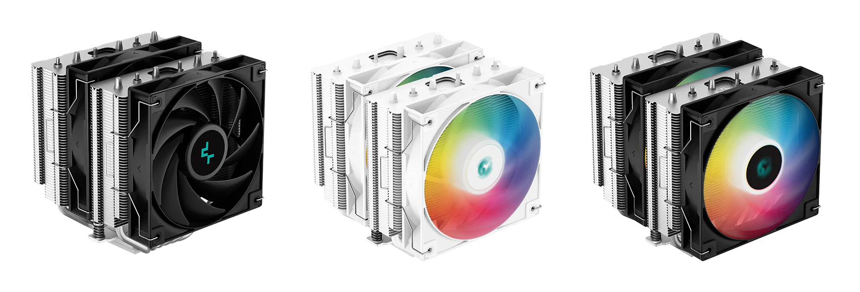Линейка кулеров DeepCool AG620 насчитывает сразу четыре модели с идентичной конструкцией и уровнем производительности. Различия между ними сводятся к оформлению вентиляторов и дизайну верхней декоративной пластины.