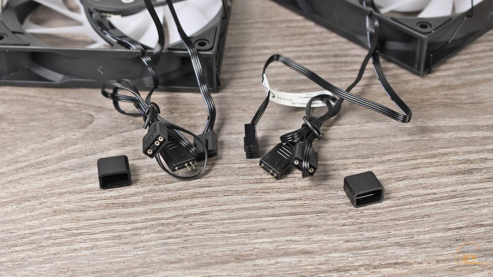 Пропеллеры отличаются низким энергопотреблением – оно не превышает 1,68 Вт. Для их подключения к материнской плате используются стандартные 4-контактные FAN-разъемы, тогда как 3-пиновые коннекторы отвечают за ARGB-свечение. Длина кабелей вполне достаточная: 23 см для питания и 40 см для подсветки.