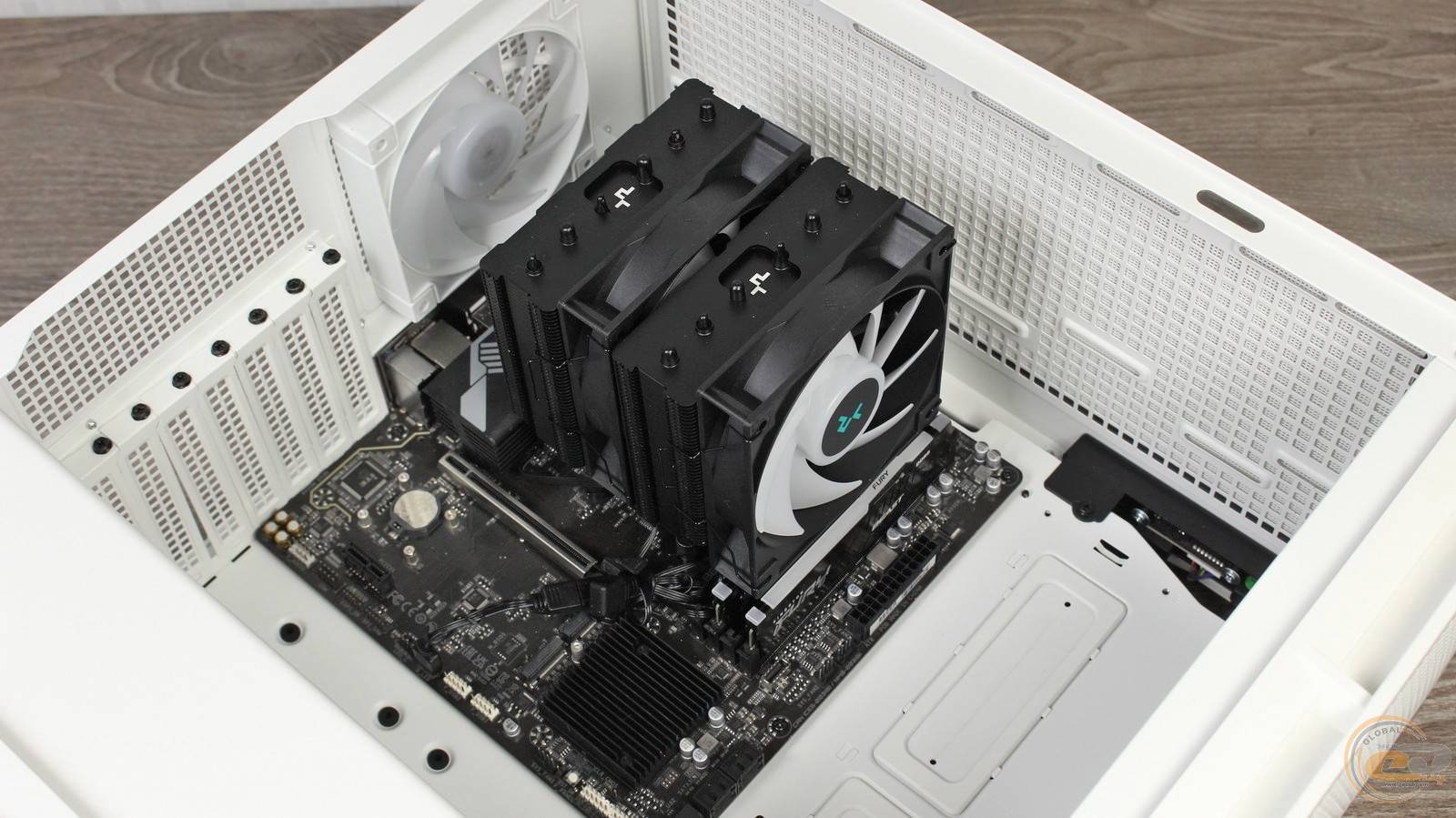 Выбирая большой процессорный кулер, следует обязательно учитывать его габариты — и DeepCool AG620 BK ARGB не исключение. Высота конструкции составляет 157 мм: этого достаточно для совместимости с большинством современных ATX-корпусов, но не со всеми. Также полная совместимость обеспечивается только с модулями оперативной памяти высотой до 45 мм.