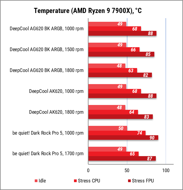 Эффективность DeepCool AG620 BK ARGB практически не отличается от ранее протестированного DeepCool AK620, что объясняется схожей конструкцией и размерами. Даже на относительно невысокой частоте вращения пропеллеров – 1000 об/мин – он обеспечивает должное охлаждение 12-ядерного процессора. Для сравнения, более дорогой be quiet! Dark Rock Pro 5 показал несколько худший результат – разница составила до 6°C.