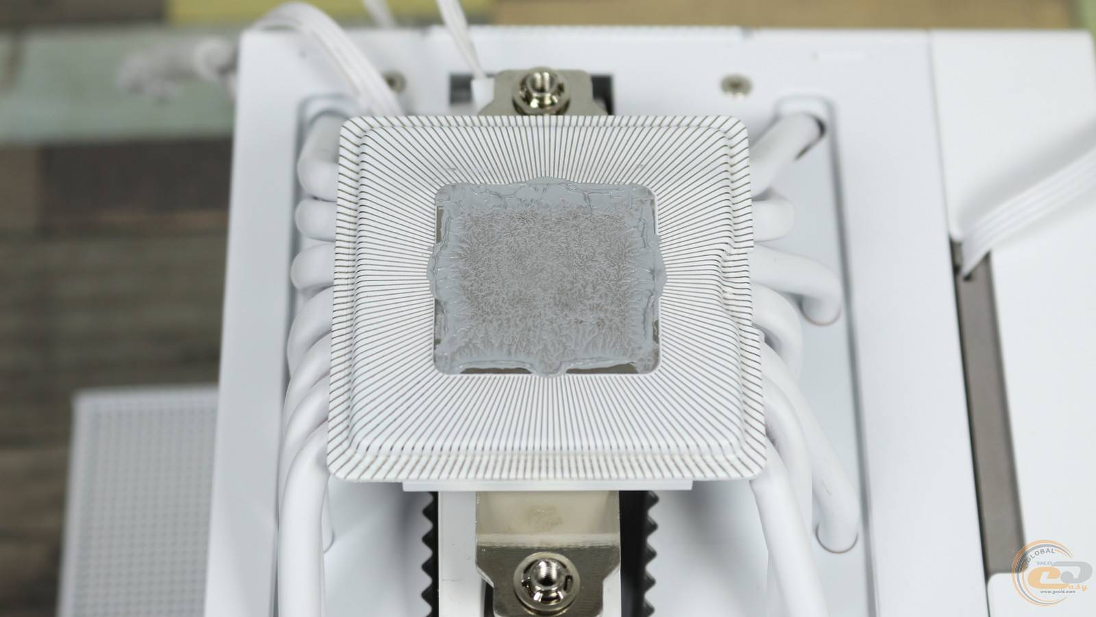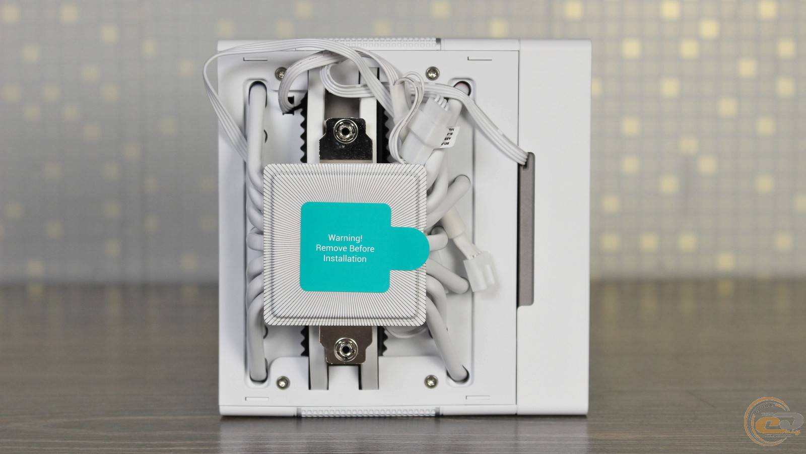 Далее на процессор наносится термопаста. Настало время снять защитную пленку с испарительной камеры и зафиксировать радиатор с помощью двух подпружиненных винтов. Доступ к последним возможен только после демонтажа 140-мм пропеллера.