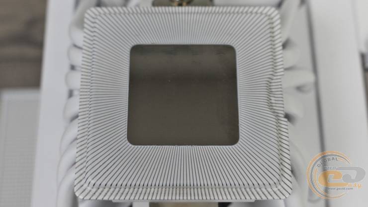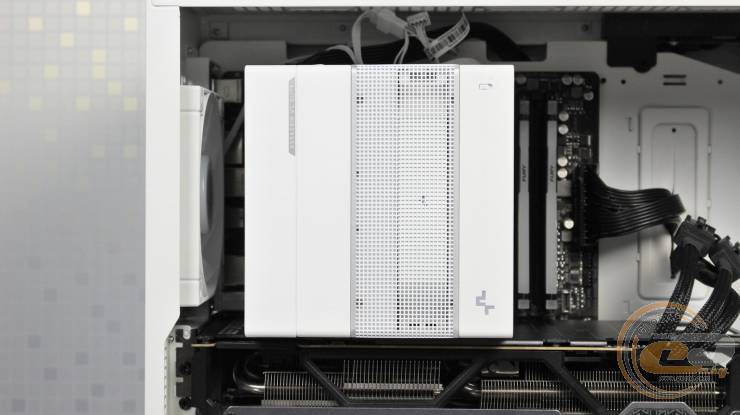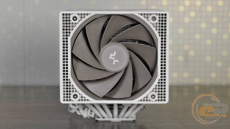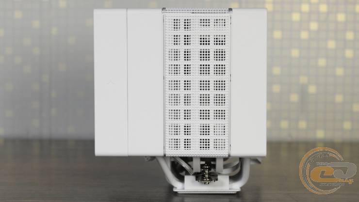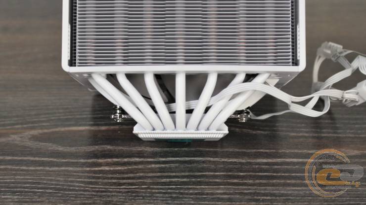 Как и подобает флагманскому воздушному охладителю, в его основе применено семь медных тепловых трубок диаметром 6 мм. В свою очередь алюминиевые пластины толщиной 0,2 мм расположены максимально плотно – с промежутком около 1 мм, что способствует повышению эффективности теплоотвода. Также никуда не исчез фирменный для DeepCool «шахматный» узор ребер.