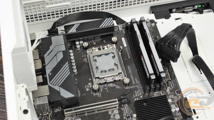 На платформе AMD Socket AM5 после снятия стандартного крепежа на лицевой стороне материнской платы устанавливаются специальные стойки с мягкими элементами. На них фиксируются комплектные монтажные кронштейны, имеющие метки для установки в нужной ориентации.