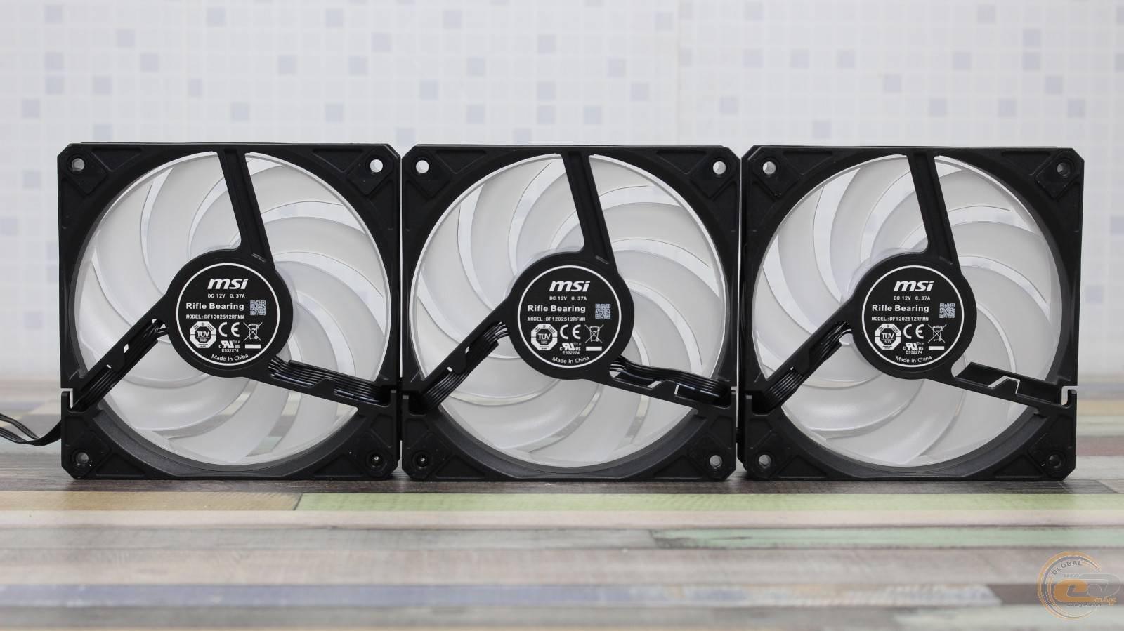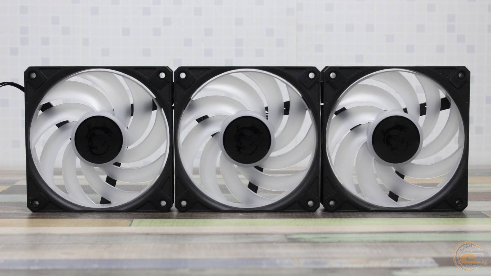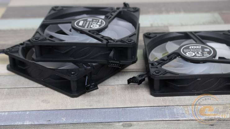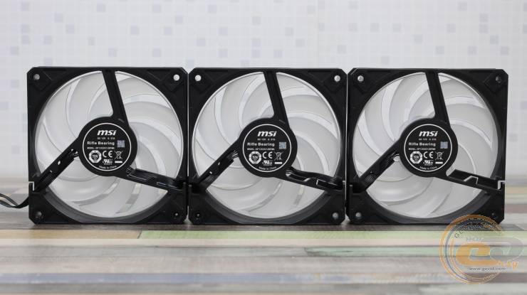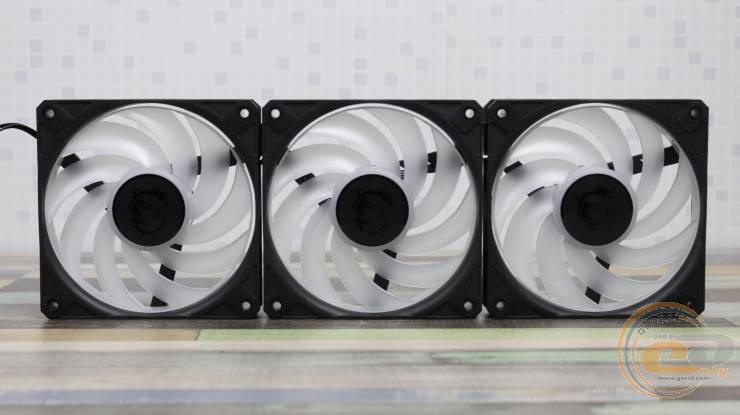 Радиатор обдувают три 120-мм вентилятора MSI DF1202512RFMN с девятью лопастями, объединенными кольцом на концах (конструкция CycloBlade 9). Вертушки получили классические габариты – 120 х 120 х 25 мм.