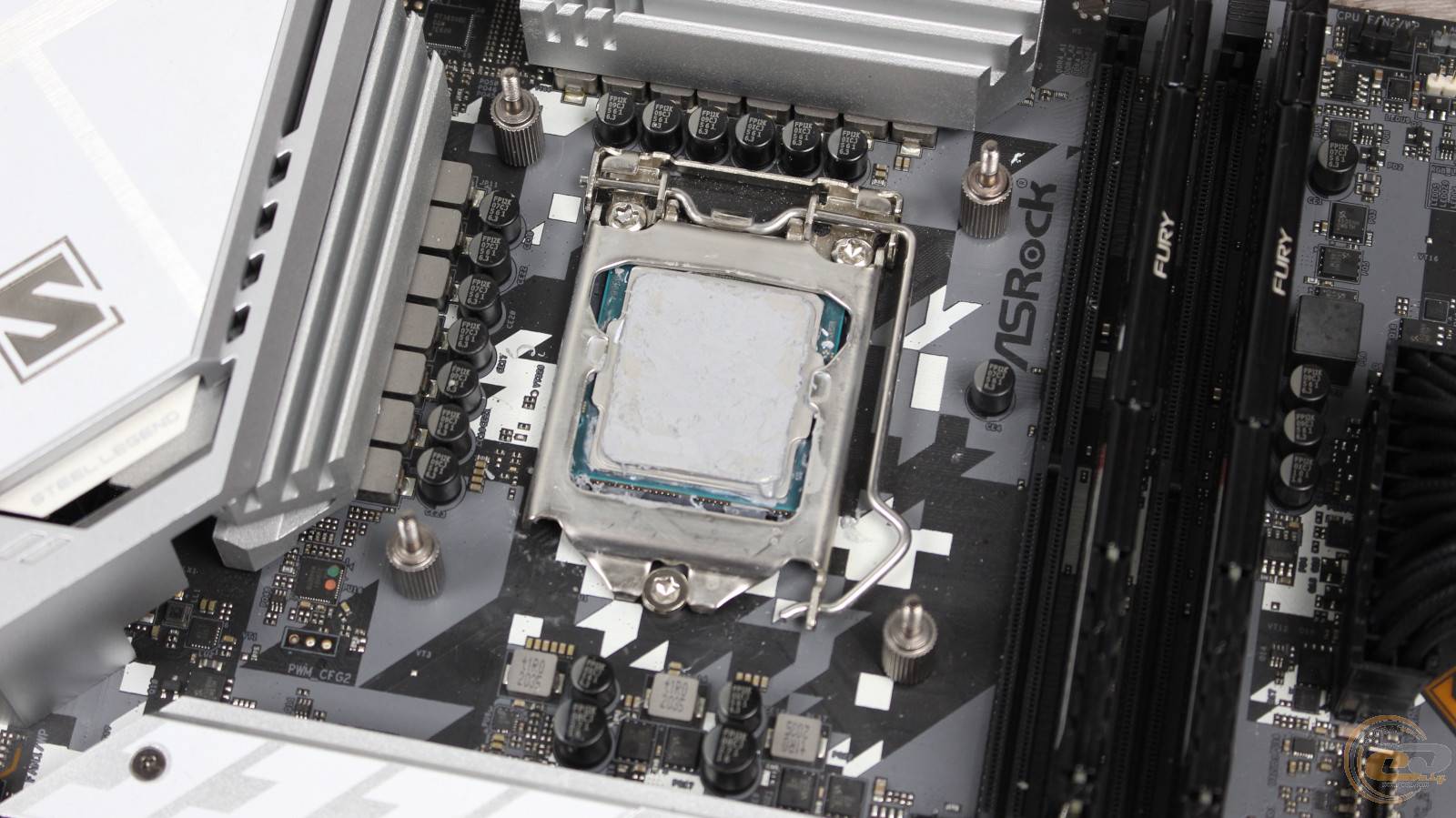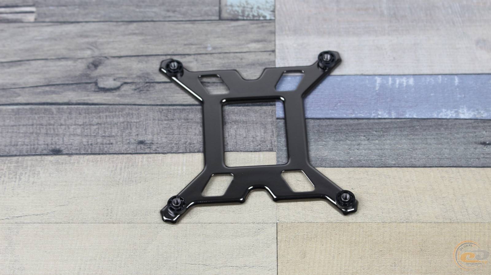 Из комплекта нам понадобится усилительная пластина для разъемов Intel. На ней мы размещаем фиксаторы в нужном для сокета Intel LGA1200 положении, а затем прикладываем ее к отверстиям крепления на обороте материнской платы.