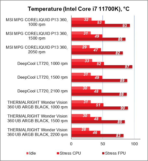 По сравнению с DeepCool LT720 преимущество MSI MPG CORELIQUID P13 360 заметно сразу. При этом разница температур в пользу последней варьируется от 3°C до 6°C в самом тяжелом сценарии нагрузки.