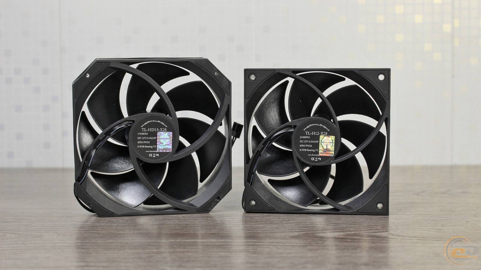 Начнём со 120-мм вентилятора Thermalright TL-H12-X28. Он получил семь лопастей, черный корпус с немного шершавой поверхностью и черными гладкими лопастями. Его фактические габариты составляют 120×120×28 мм. Боковые грани стилизованы подобно декоративным пластинам радиатора. В углах с обеих сторон расположены резиновые демпферы для уменьшения вибрации. Поддержка ШИМ-регулировки позволяет изменять скорость вращения лопастей в диапазоне 0 – 2150 ± 10% об/мин с максимальным уровнем шума до 29,4 дБ(А) включительно. Заявленный максимальный воздушный поток этой модели составляет 80,45 CFM (136,68 м³/ч), а статическое давление равно 2,65 мм вод. ст. В его основе лежит гидродинамический подшипник.