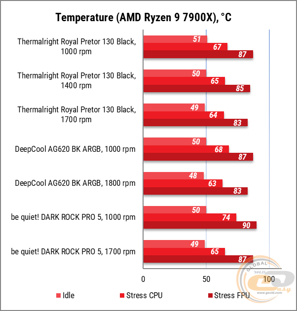 По большей части температурные показатели процессора при использовании Thermalright Royal Pretor 130 BLACK можно назвать аналогичными результатам Deepcool AG620 BK ARGB. Однако на максимальных оборотах вертушки от Thermalright оказываются несколько тише. Так что, учитывая меньшую цену Thermalright Royal Pretor 130 BLACK, будет более логично выбрать именно его.