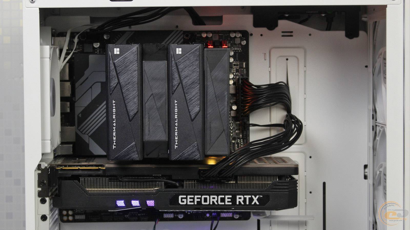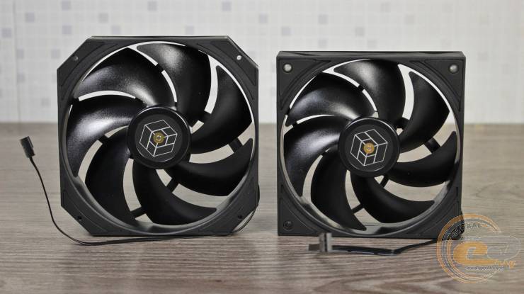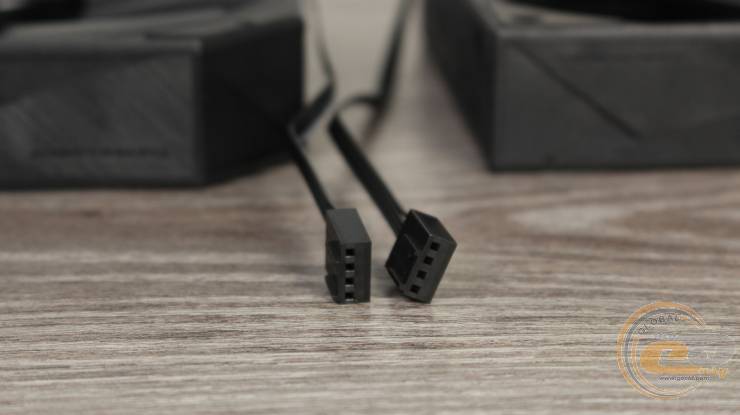 Питается каждый вентилятор с помощью 4-контактного кабеля без оплетки длиной 22 см. Подсветка на обеих вертушках отсутствует.