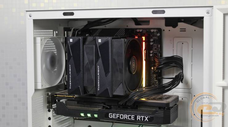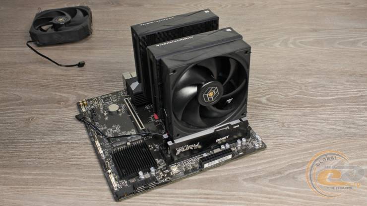 В ходе проверки эффективности охлаждения Thermalright Royal Pretor 130 BLACK и его оппонентов температура окружающей среды составила 23°С. Три 140-мм (на вдув) и один 120-мм (на выдув) корпусные вентиляторы работали со скоростью 1000 об/мин.