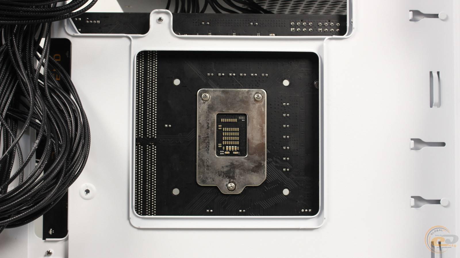 Берем из комплекта поставки усилительную пластину для разъемов Intel, размещаем на ней фиксаторы в соответствующем для сокета Intel LGA1200 положении и прикладываем ее к соответствующим отверстиям крепления на обороте материнской платы.