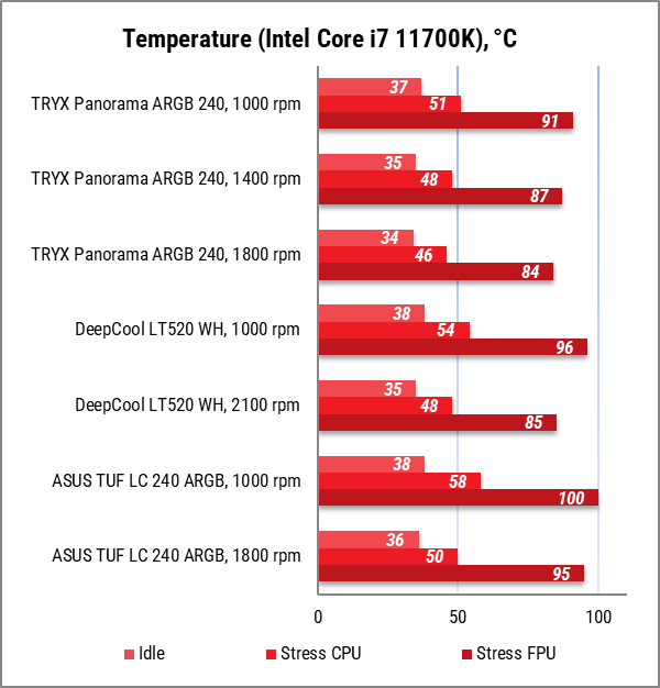 При использовании всех трех СЖО на максимальных оборотах преимущество TRYX PANORAMA ARGB 240 также сохранилось, но DeepCool LT520 WH уступало ему уже только на 1-2°C. ASUS TUF GAMING LC 240 ARGB все еще была далеко позади, демонстрируя на 11°C худшие температуры в самом тяжелом нагрузочном сценарии.