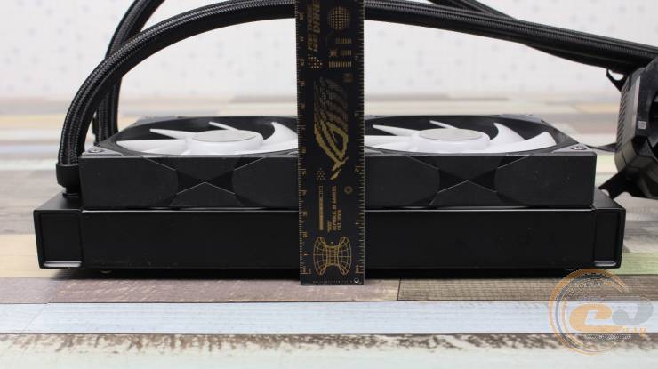 Тратить время на фиксацию вертушек на радиаторе не нужно, ведь производитель позаботился об этом заранее. Толщина системы вместе с вентиляторами, учитывая головки крепежных винтов, составляет 56 мм в профиль.