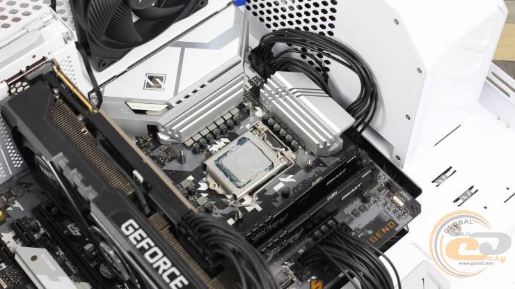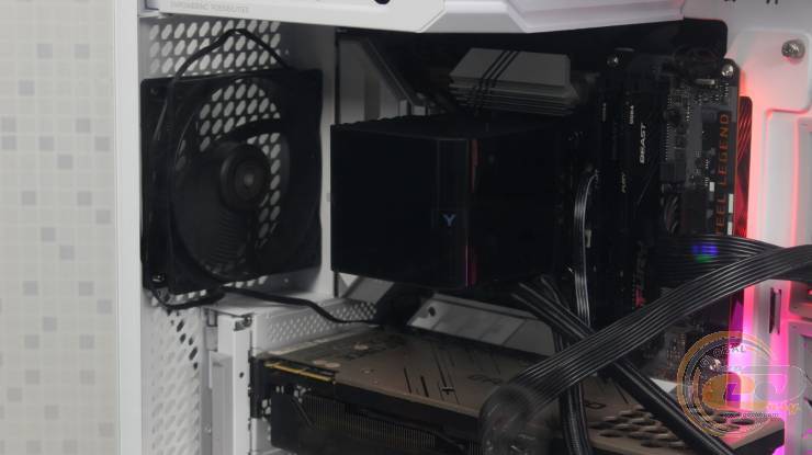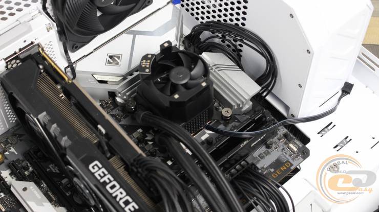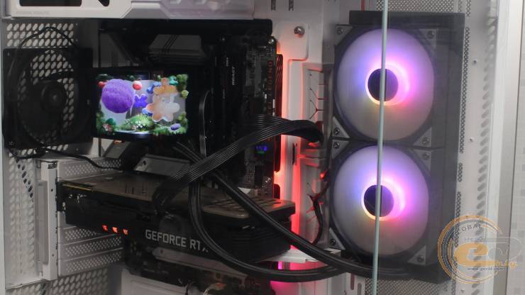При проверке эффективности работы TRYX PANORAMA ARGB 240 в корпусе на тыльной панели мы установили один 120-мм вентилятор be quiet! PURE WINGS 3 на выдув. Также на нижней панели мы разместили три вертушки be quiet! PURE WINGS 3 140mm PWM high-speed в положении на вдув. Тыльный вентилятор работал со скоростью 1500 об/мин, а три нижних – 1800 об/мин. Температура воздуха в помещении тестовой лаборатории на момент проведения измерений составляла 18°С.