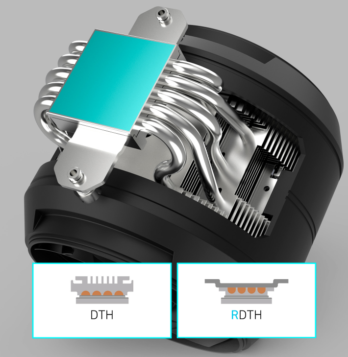 В конструкции использована технология RDTH (Reverse Direct Touch Heatpipe) — обратный прямой контакт тепловых трубок с процессором. В отличие от классической DTH-схемы, где отшлифованные трубки непосредственно прилегают к теплораспределительной крышке процессора, RDTH благодаря особому их расположению обеспечивает большую площадь рассеяния тепла. Это снижает тепловое сопротивление, повышает эффективность охлаждения и позволяет кулеру с уверенностью справляться даже с мощными процессорами под высокой нагрузкой.